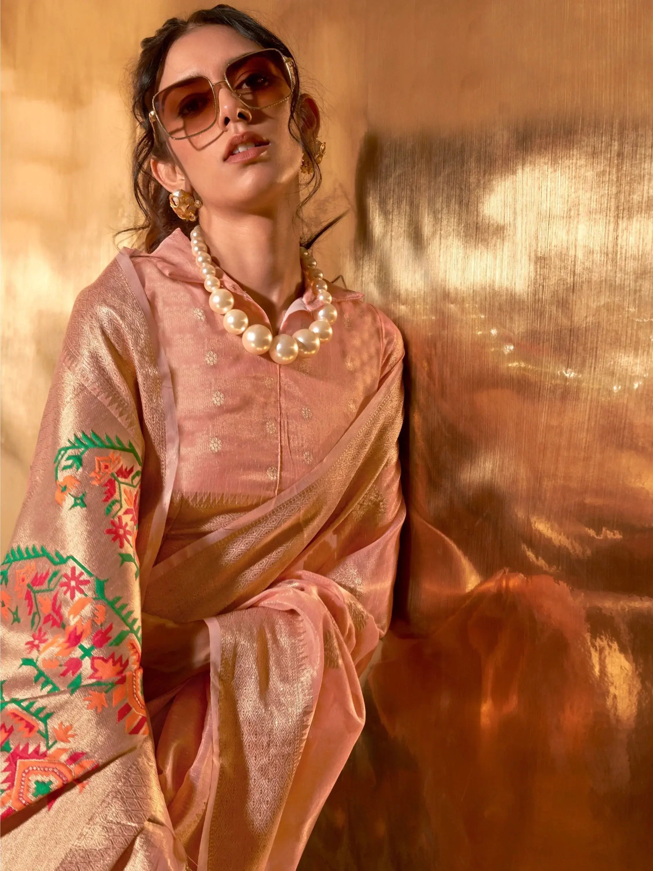 Made from premium quality tissue silk material, this saree features exquisite zari weaving work that adds a touch of glamour to the timeless peach color.