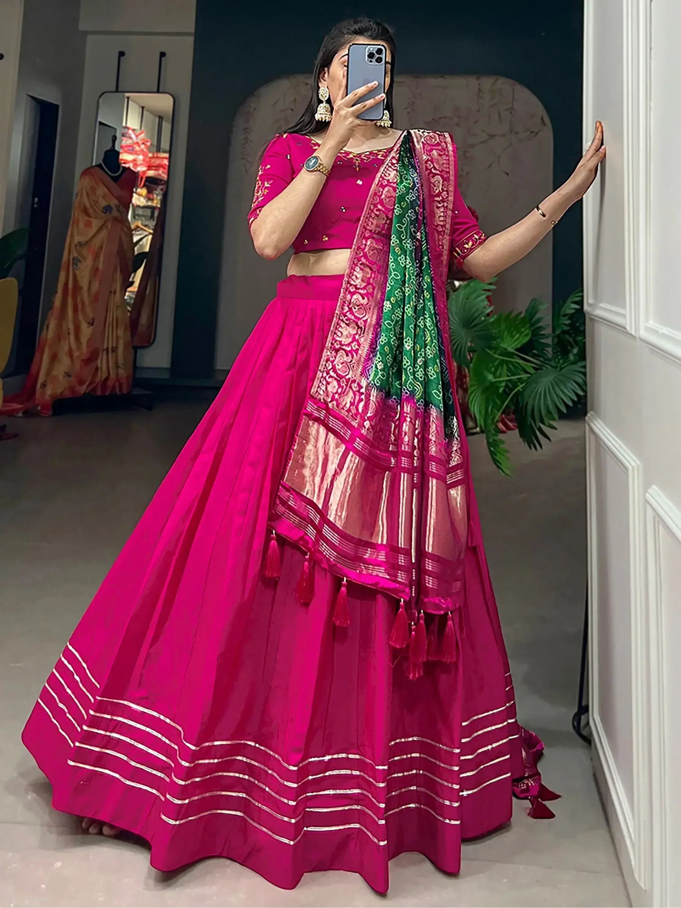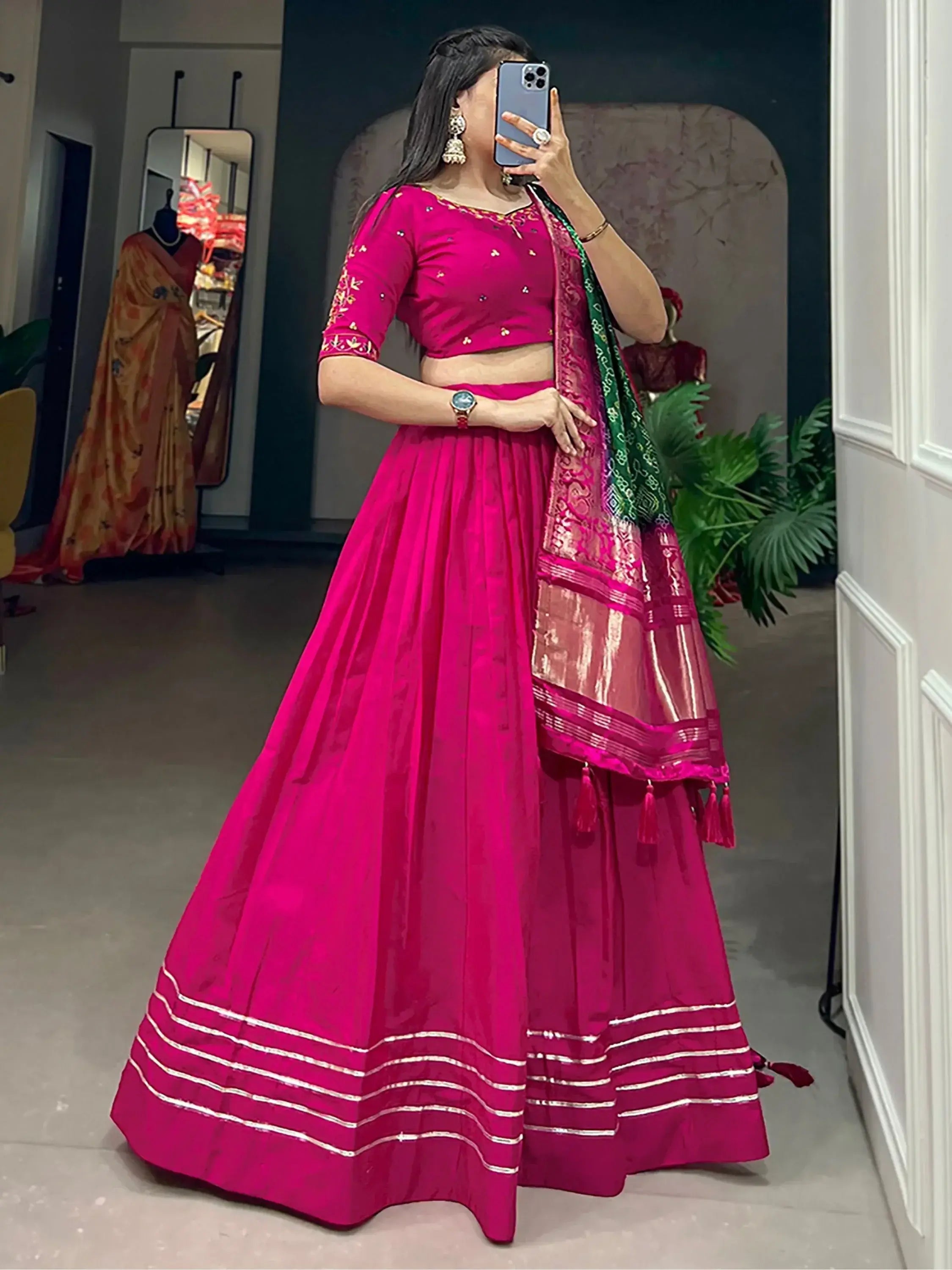 The lehenga is made from a high-quality cotton material in a stunning pink color, giving it a delightful and enchanting appeal. It features intricate gota patti touch-up work, adding a touch of elegance and sophistication to the overall design. This exquisite detail makes the lehenga stand out and brings attention to your attire.
