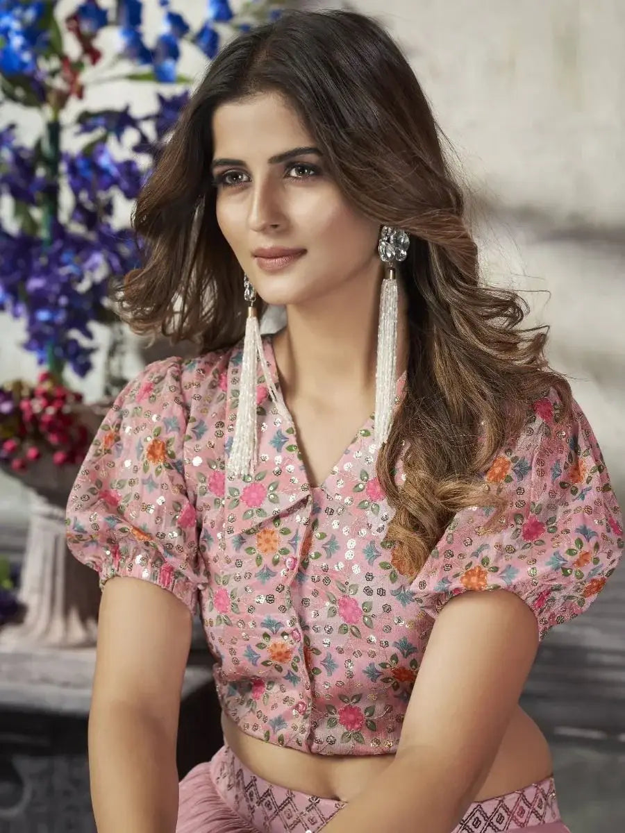 This pink lehenga arrives with a same color art silk material choli with short balloon sleeves and front buttons along with collar prettify with sequins work.