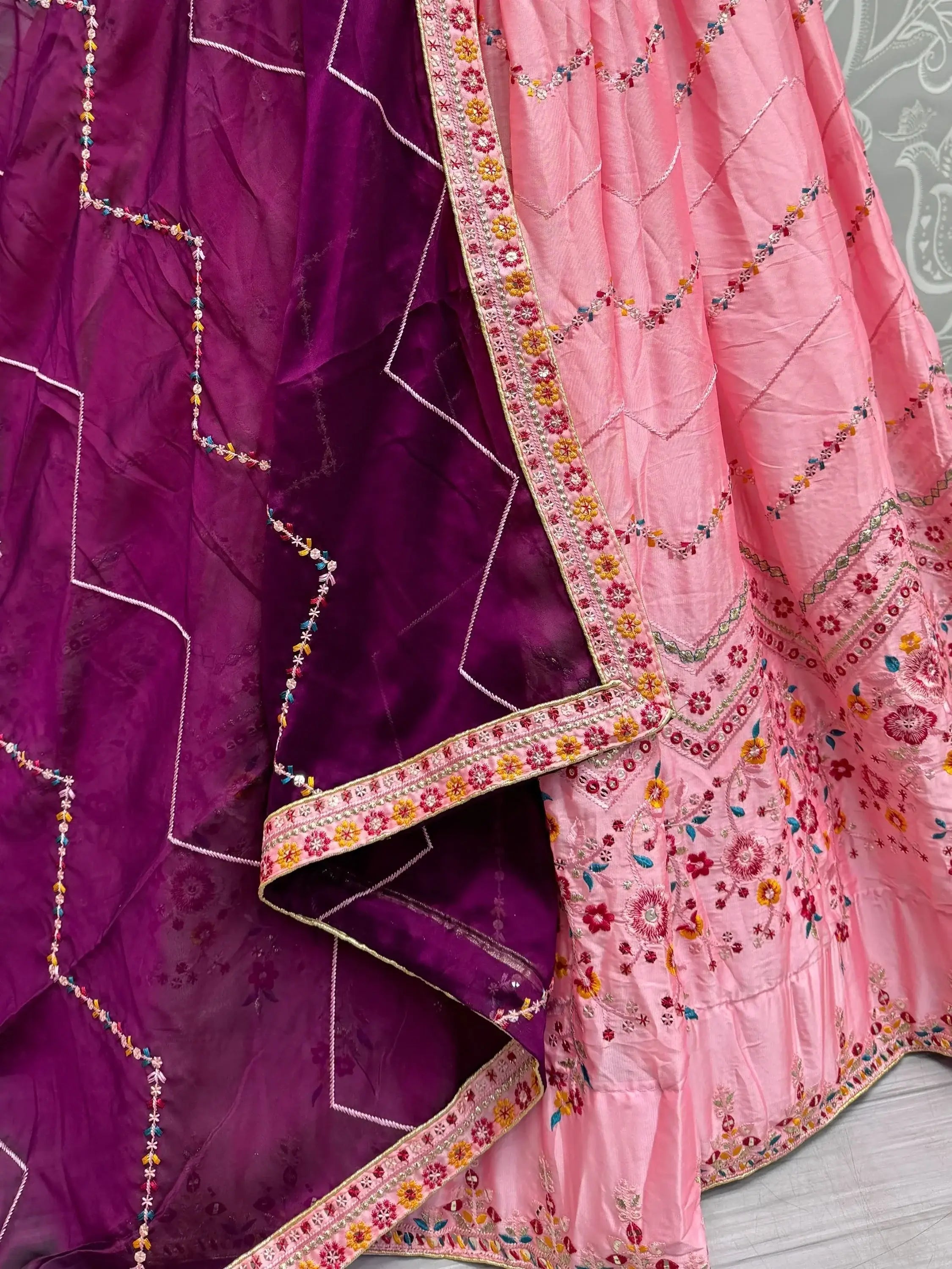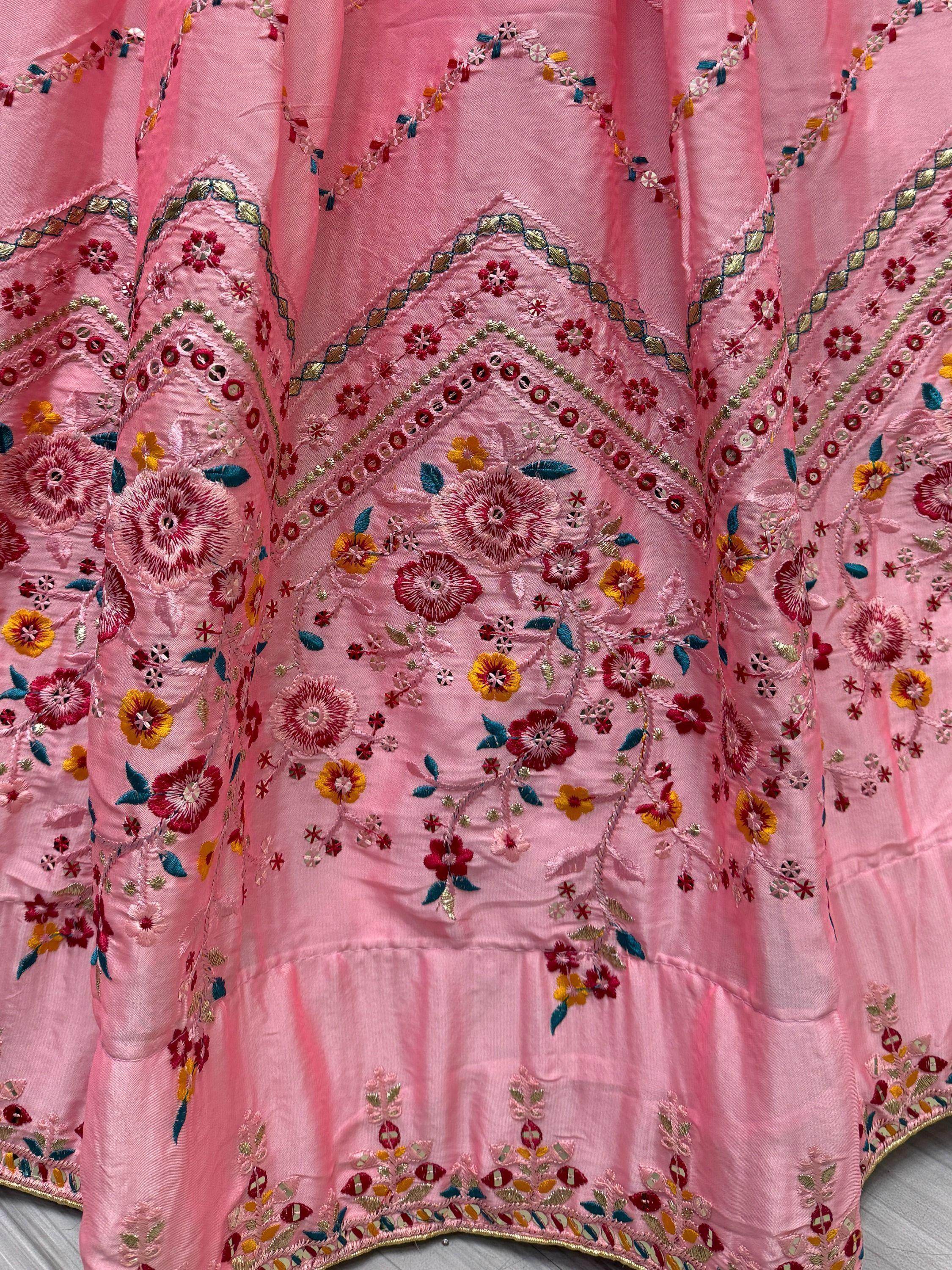 Indulge in the epitome of elegance with this mesmerizing pink rangoli silk lehenga ensemble, meticulously crafted with intricate threadwork, sequins, and zari detailing. The richness of the fabric, combined with the artistry of the embellishments, exudes a regal charm that is bound to captivate onlookers.