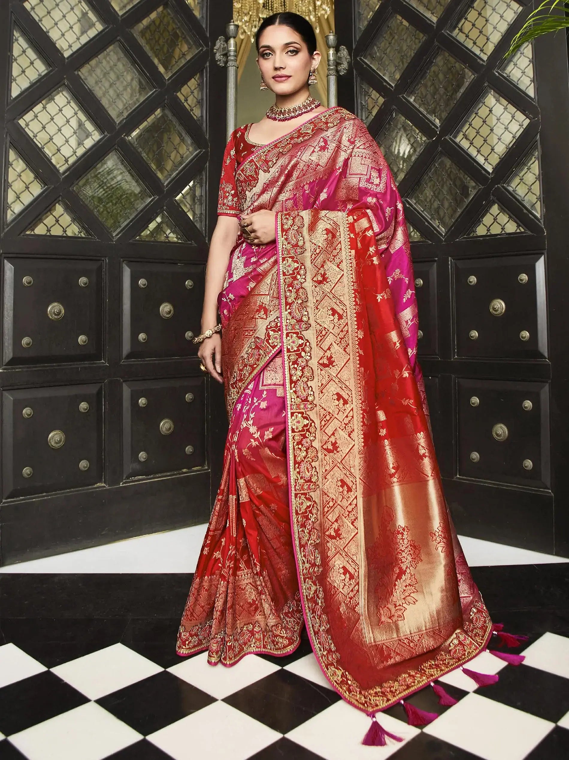 Add a touch of timeless beauty to your wardrobe with this stunning pink silk saree, exquisitely crafted with intricate zari weaving work that reflects tradition and grace.
