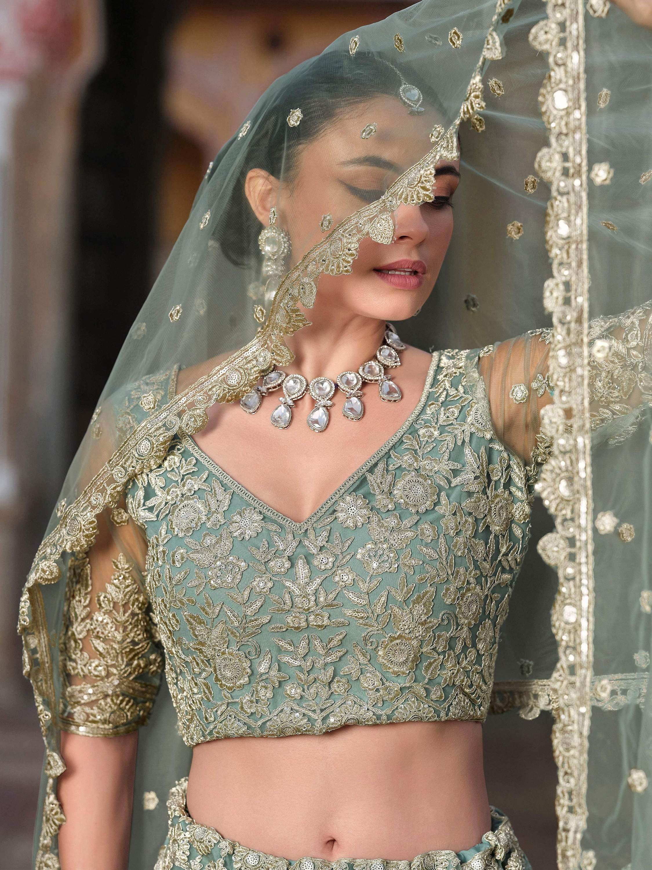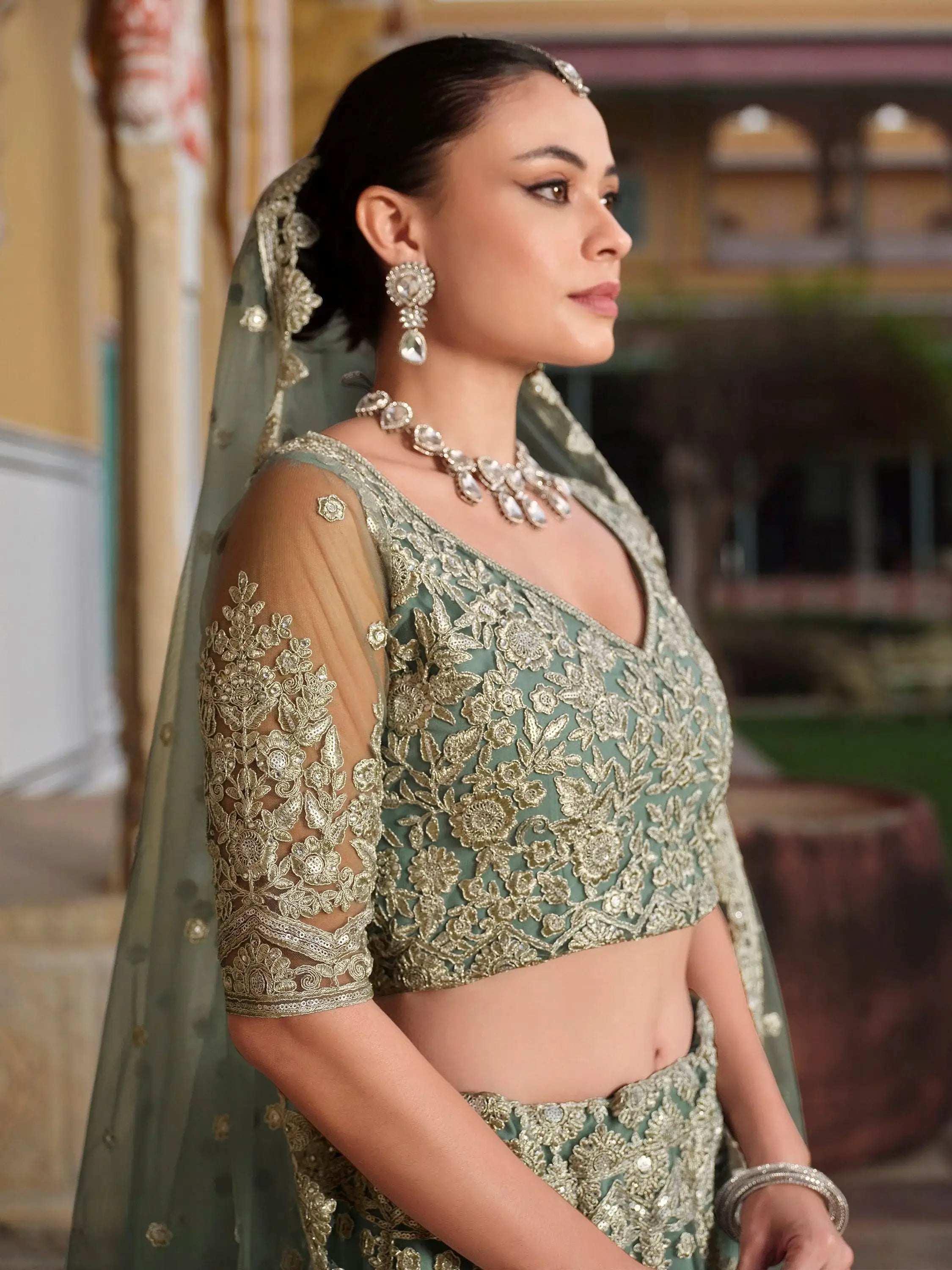 Pista Green Dori Thread Embroidered Net Wedding Lehenga Choli