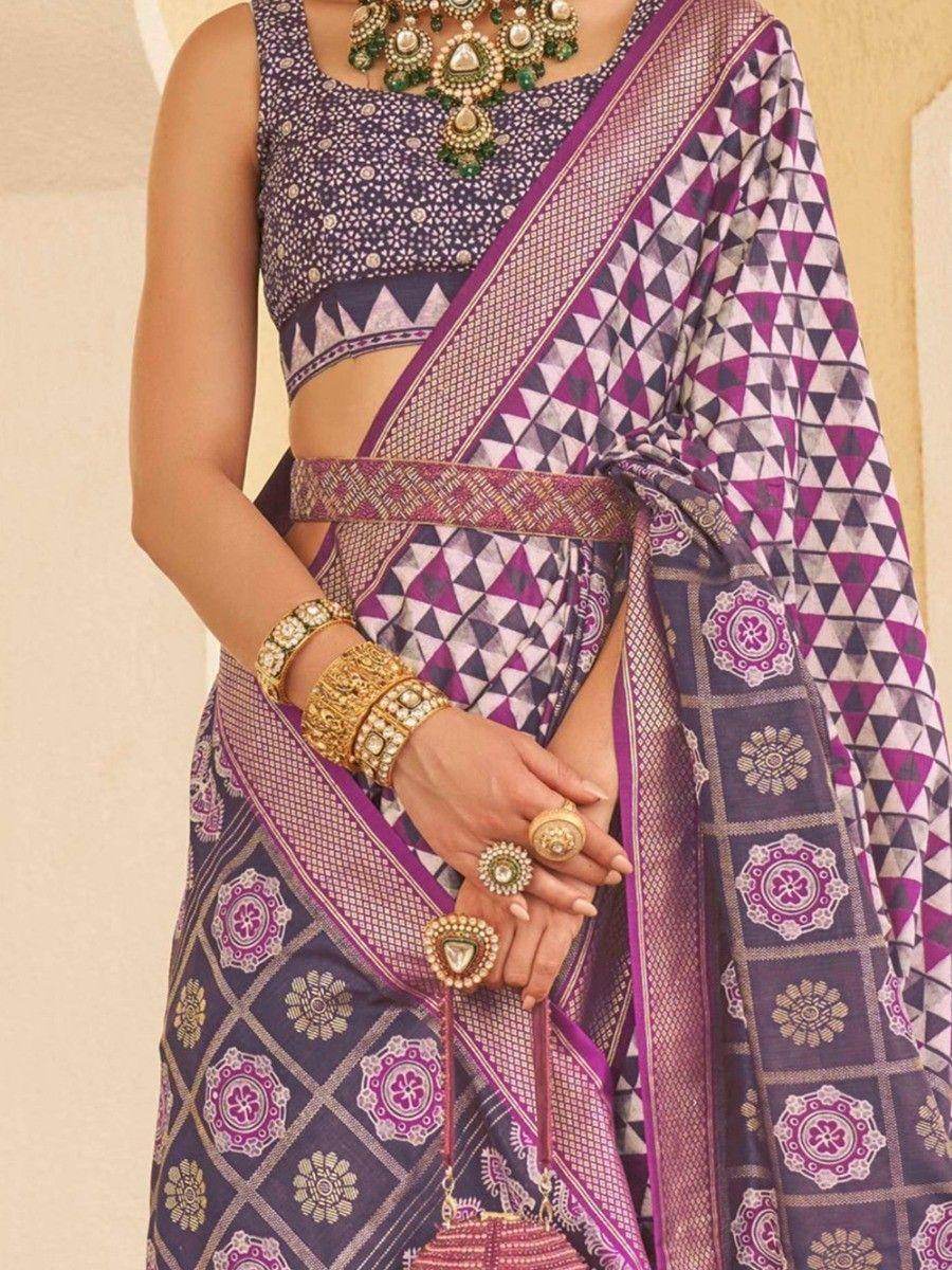 The saree is made of high-quality silk material, known for its luxurious texture and smoothness. The purple color adds a touch of elegance and sophistication, while the digital print work enhances its visual appeal. The intricate zari weaving work adds a traditional touch, making it a perfect blend of modern and ethnic styles. Additionally, the attached tassels add a playful element to the saree, enhancing its overall charm.