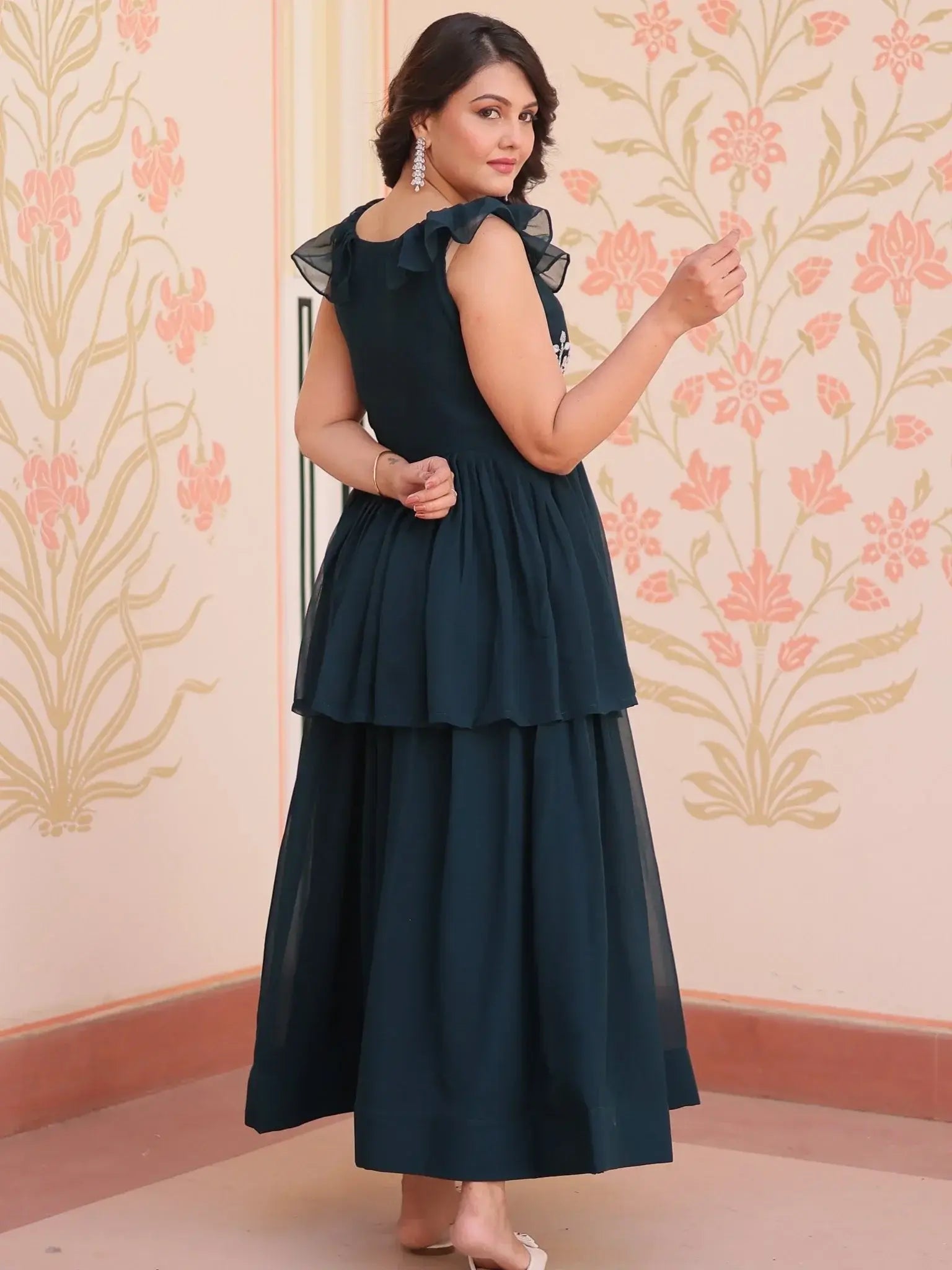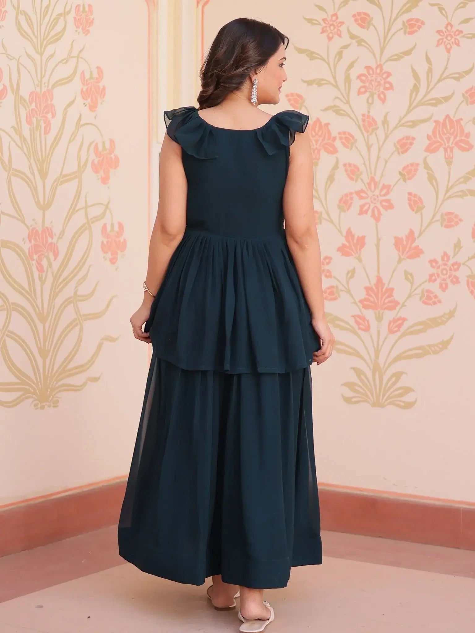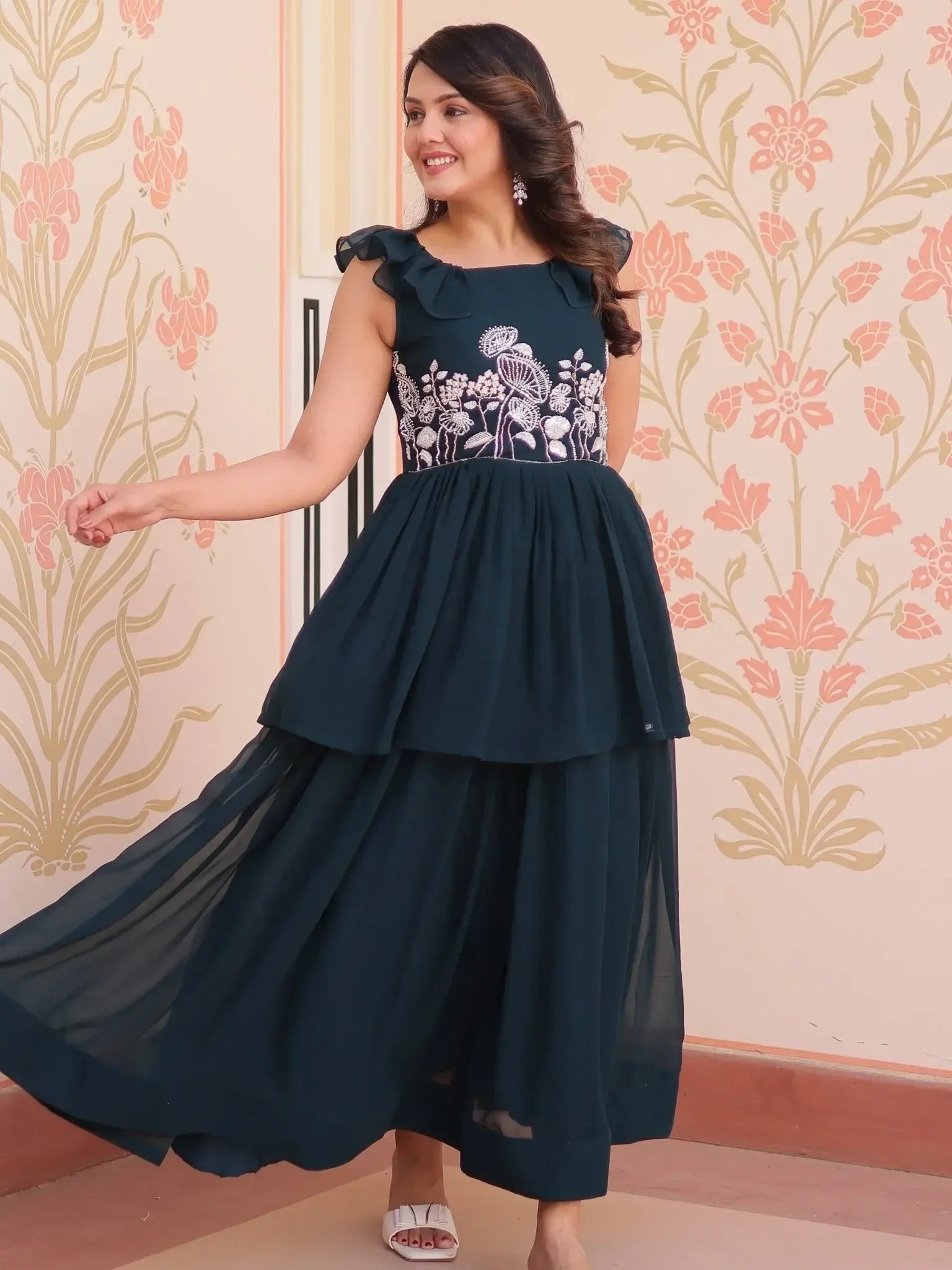 Make a graceful statement in this fully stitched Rama-colored gown crafted from premium georgette fabric. Adorned with intricate bead embroidery, it brings a touch of elegance to any festive or special occasion.