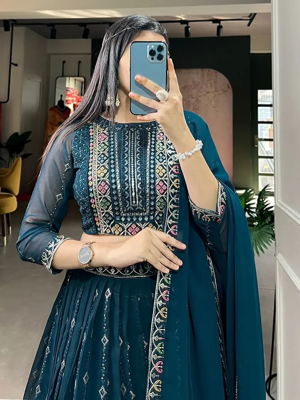Whether you're the bride, a bridesmaid, or a guest, this ensemble is sure to make your special day even more memorable. Embrace the timeless beauty and unmatched craftsmanship of this teal blue georgette lehenga ensemble and step into the spotlight with confidence and style.