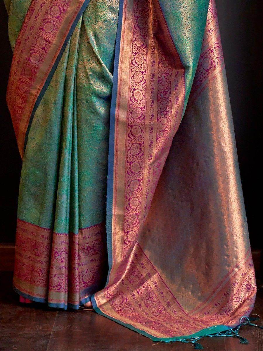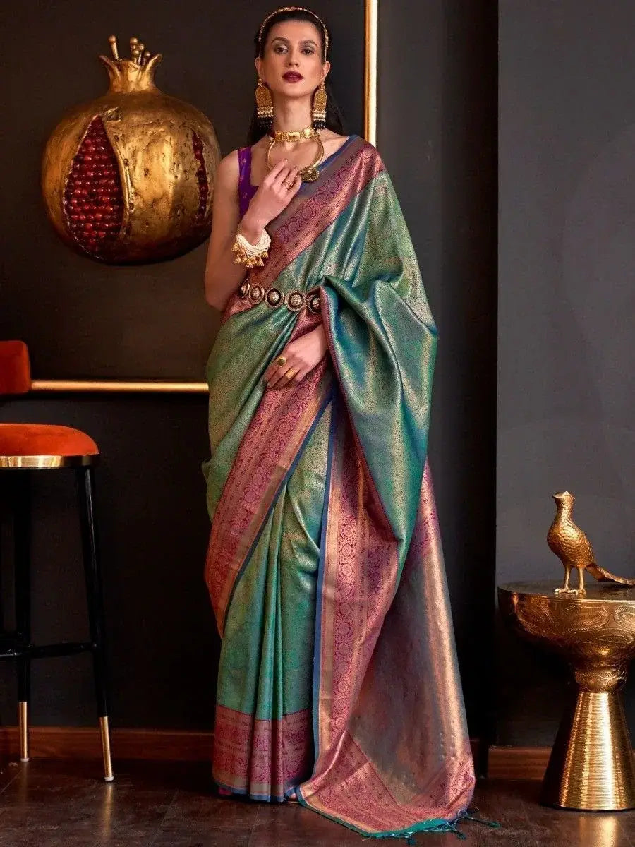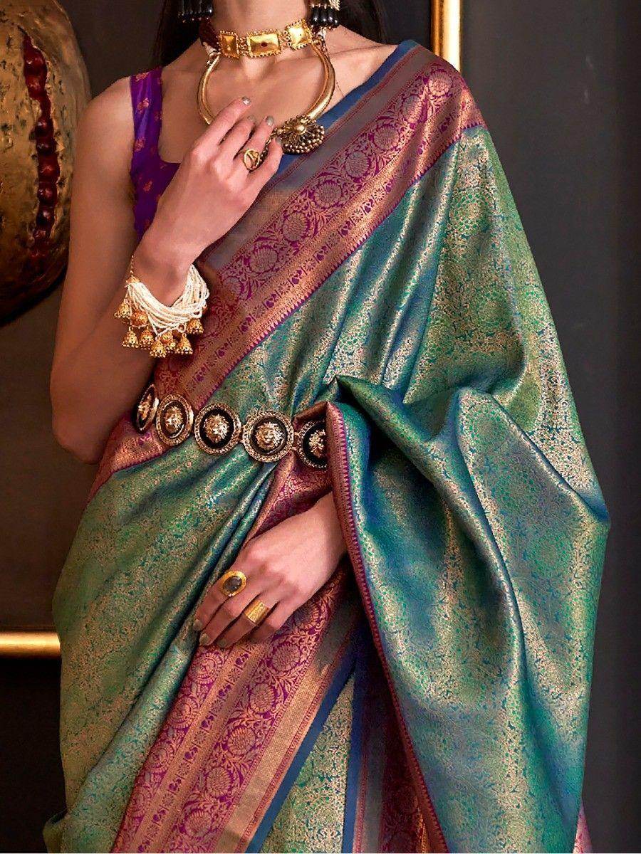 Introducing our charming teal green weaving silk event wear saree with blouse, a stunning masterpiece that will elevate your traditional look to new heights.