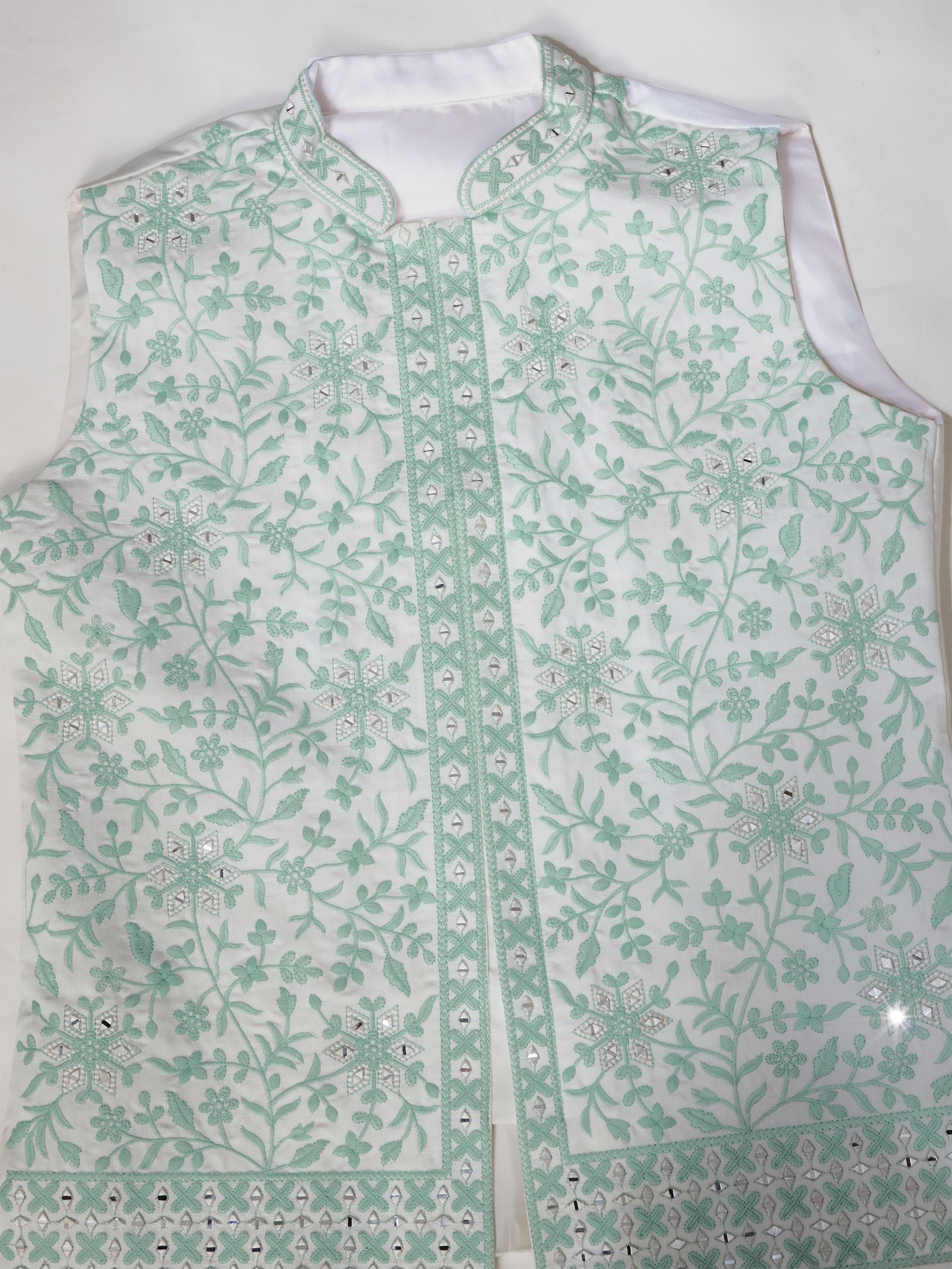 The nehru jacket features exquisite thread embroidery in soft mint green with mirror accents, adding a hint of shimmer and depth. Floral and geometric motifs run symmetrically across the jacket, framed with detailed borders for a rich ethnic finish.