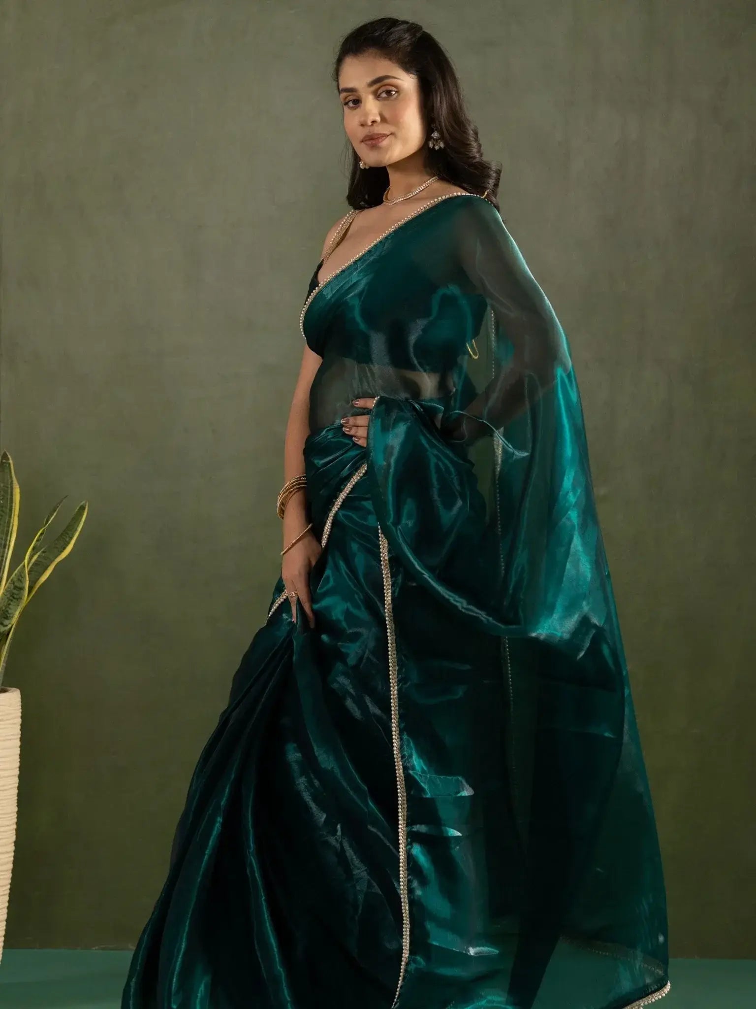 Drape yourself in elegance with this enchanting dark green pre-stitched chiffon saree. Featuring a refined lace border, it exudes sophistication and grace.