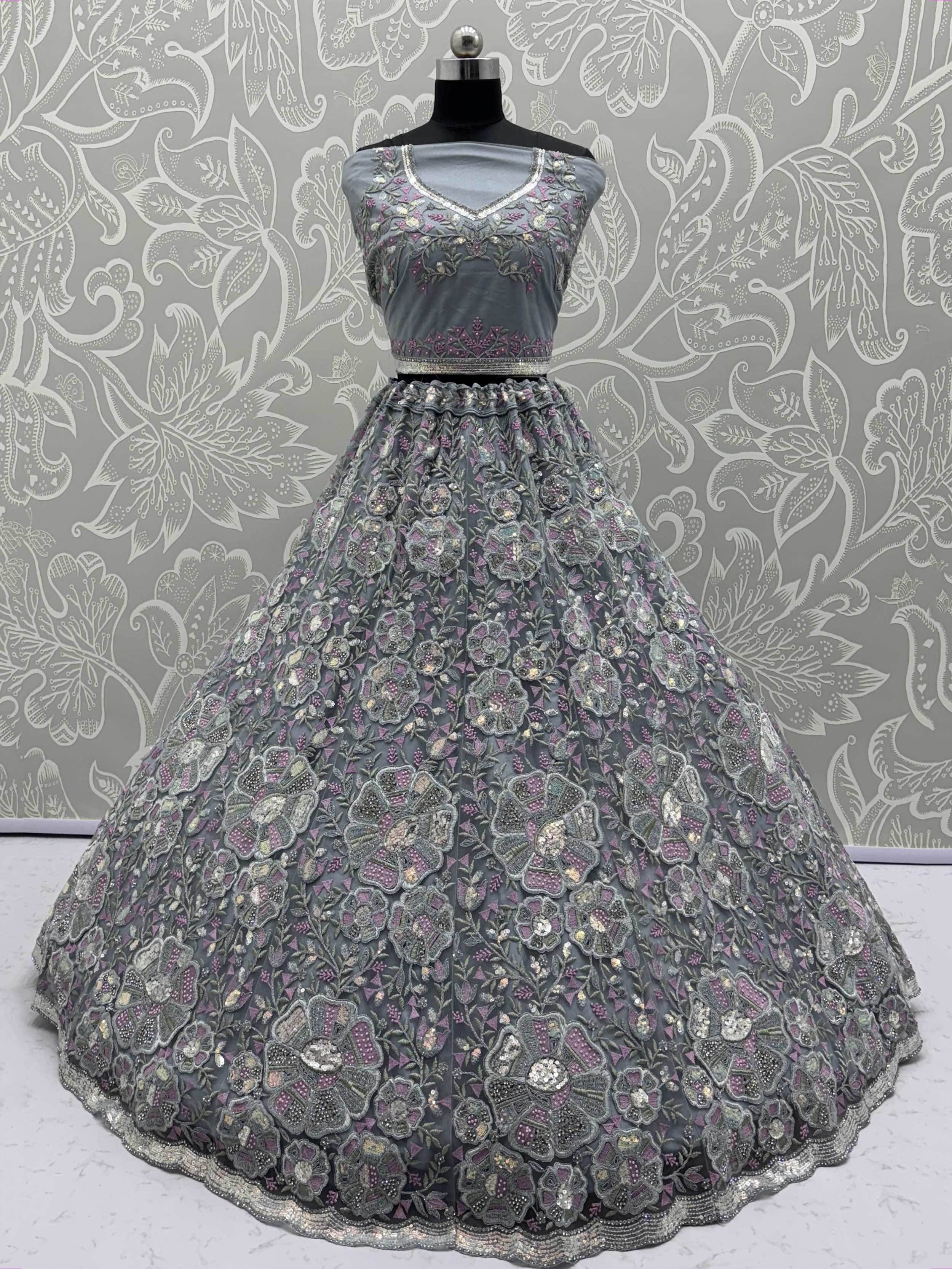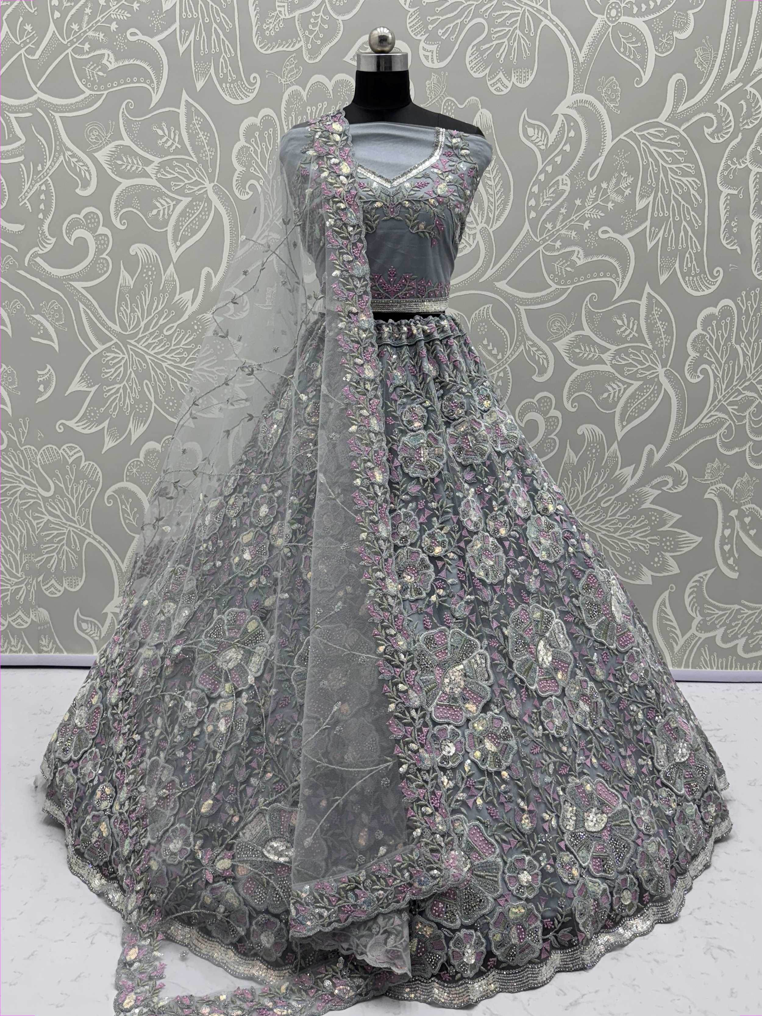 This grey net lehenga choli is an elegant ensemble crafted with intricate detailing and embellishments. The entire outfit is highlighted with a stunning flower embroidery pattern, giving it a rich and traditional touch.