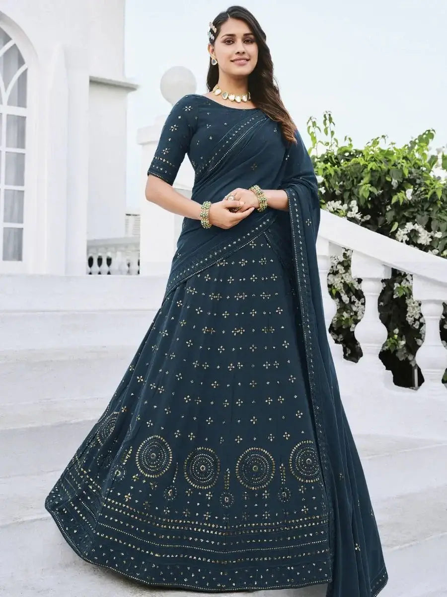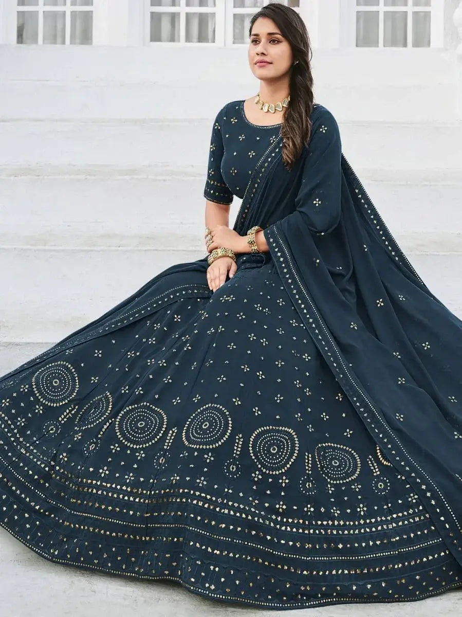 Fall in love with this fashionable teal blue sequined Lehenga very light in weight and made with georgette material embellished by sequins and thread embroidery.