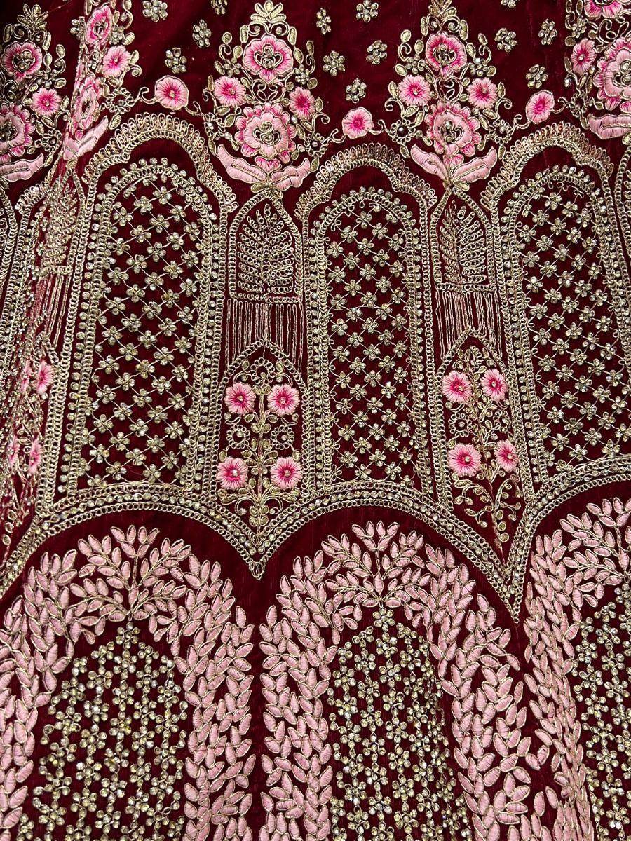 Designed with meticulous attention to detail, this lehenga set features a heavy velvet lehenga and choli in a charming maroon color. The rich velvet fabric not only adds a touch of luxury but also provides a flattering silhouette, making you feel like a true princess on your wedding day.