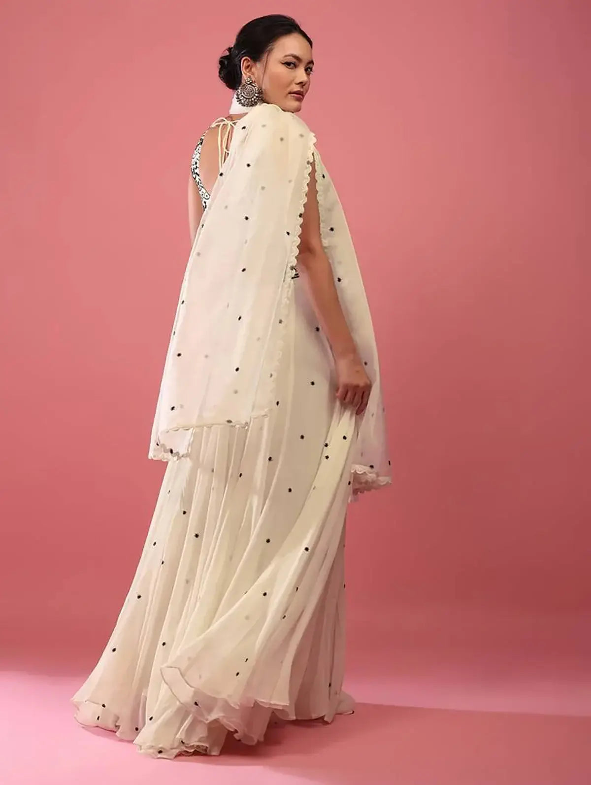Completing the look, the dupatta, crafted from soft georgette, adds fluidity to the outfit. Adorned with minimal embroidered dots and scalloped lace edges, it ties the entire ensemble together with understated grace.