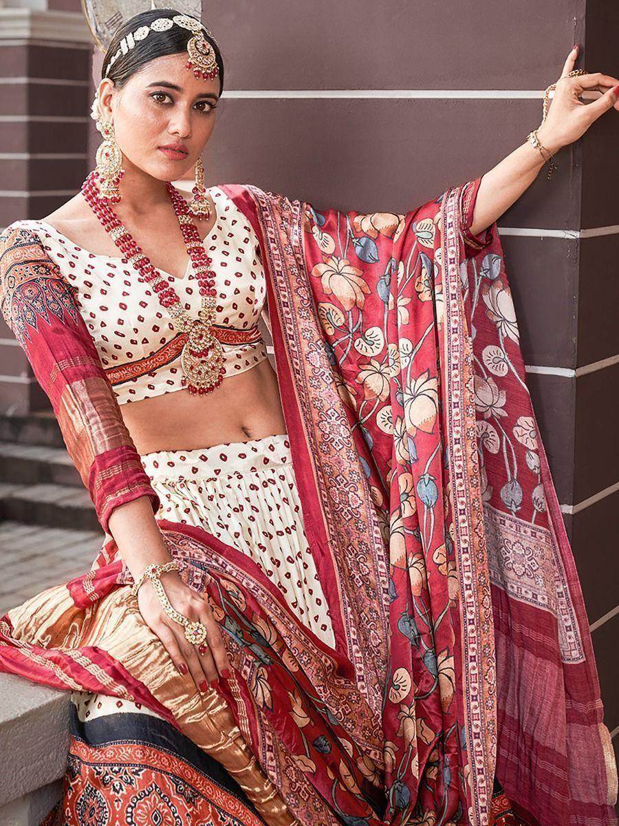 This cream-color designer printed lehenga arrives with similar color gajhi silk material choli created with prints and contrast sleeves. It also comes with a maroon color gajji silk material dupatta created madhubani prints.