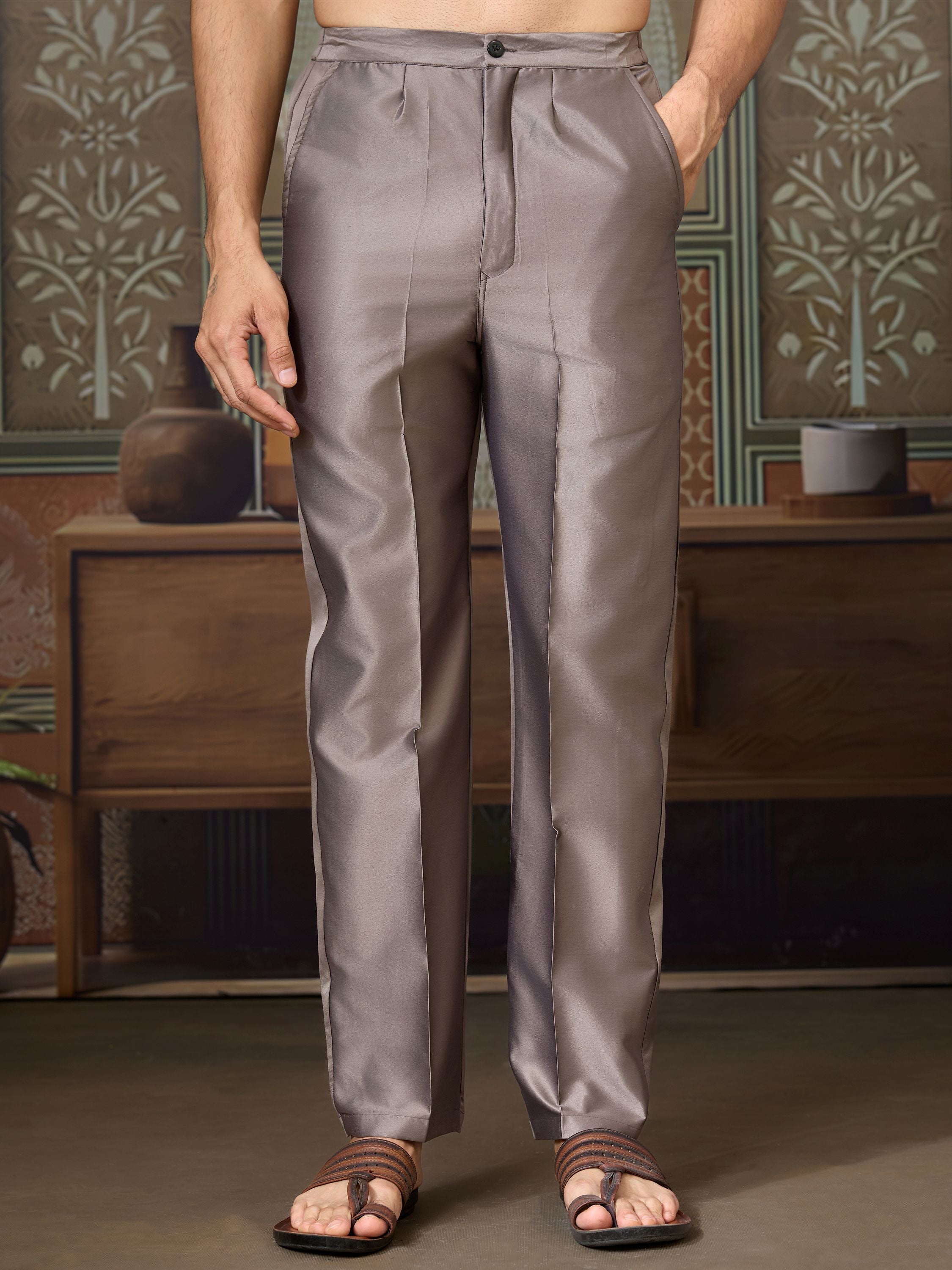 Thissilk grey kurta set in an elegant taupe shade radiates refined sophistication. The detailed embroidery near the hem and cuffs showcases intricate floral and bird motifs, inspired by royal Mughal gardens, lending it a majestic charm.