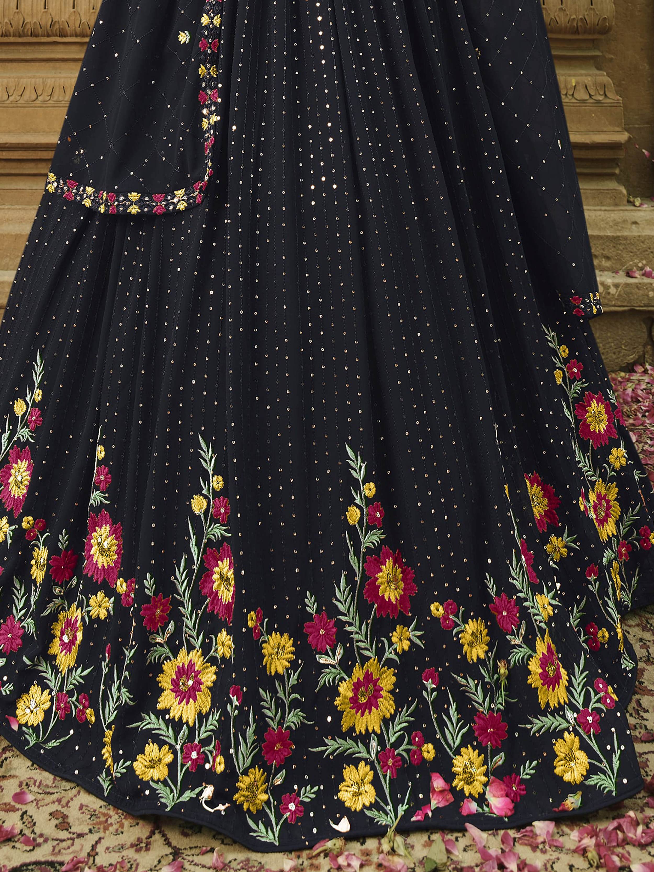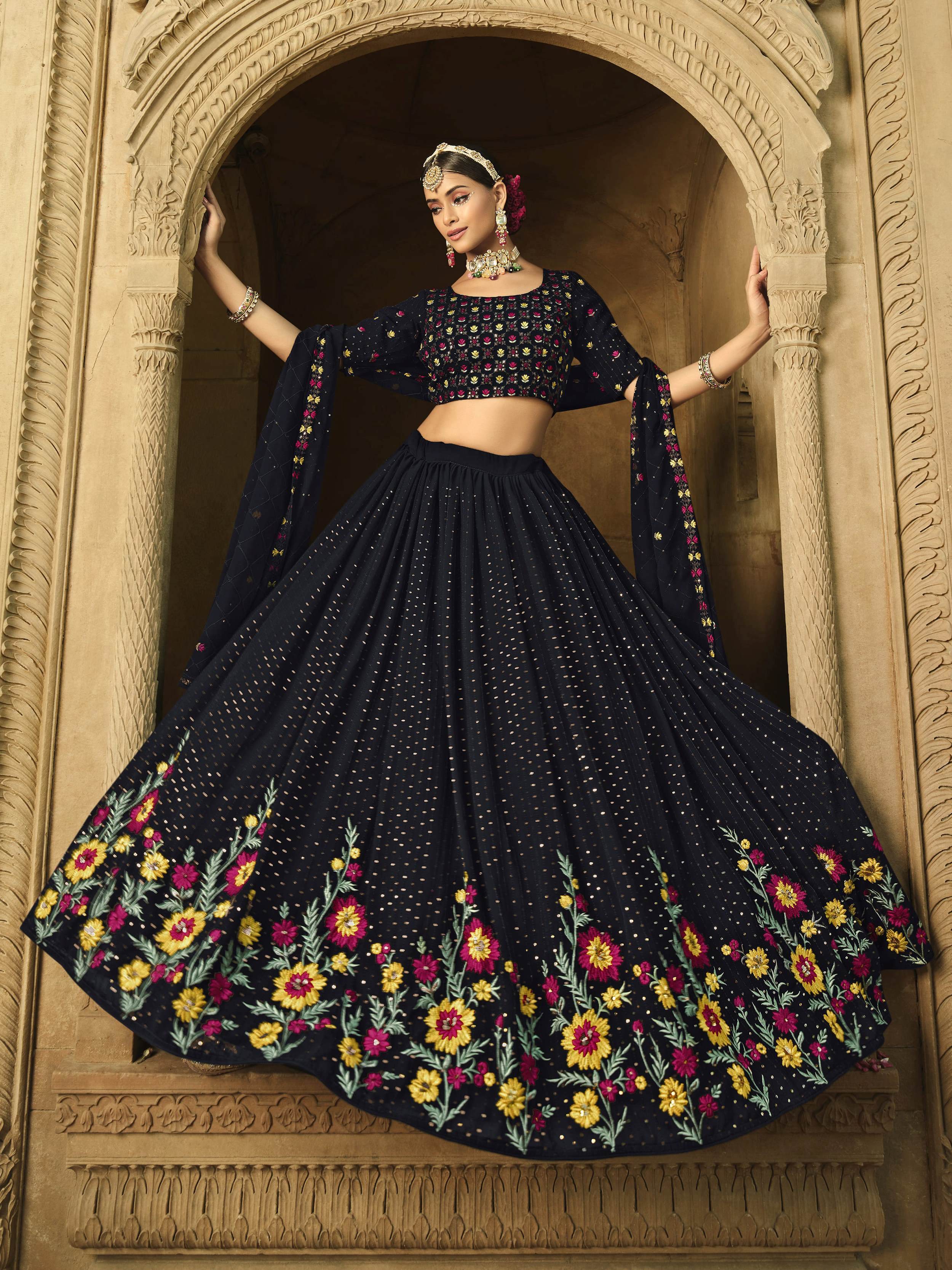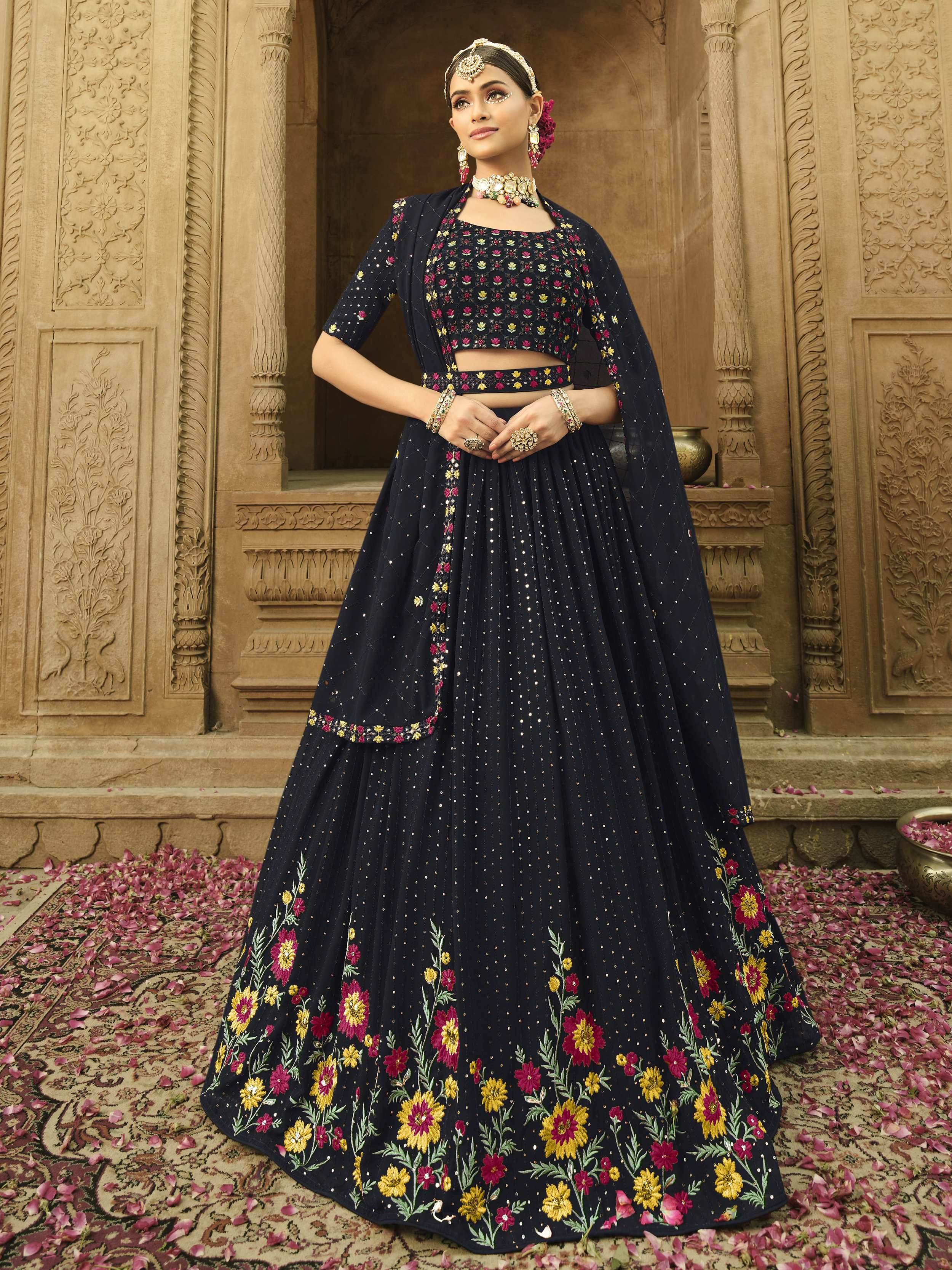 We unfurl the intricacy and exclusivity of our creations highlighted with this pleasing navy blue colored georgette fabric lehenga completed with magnetic multi-color thread and sequins embroidery.