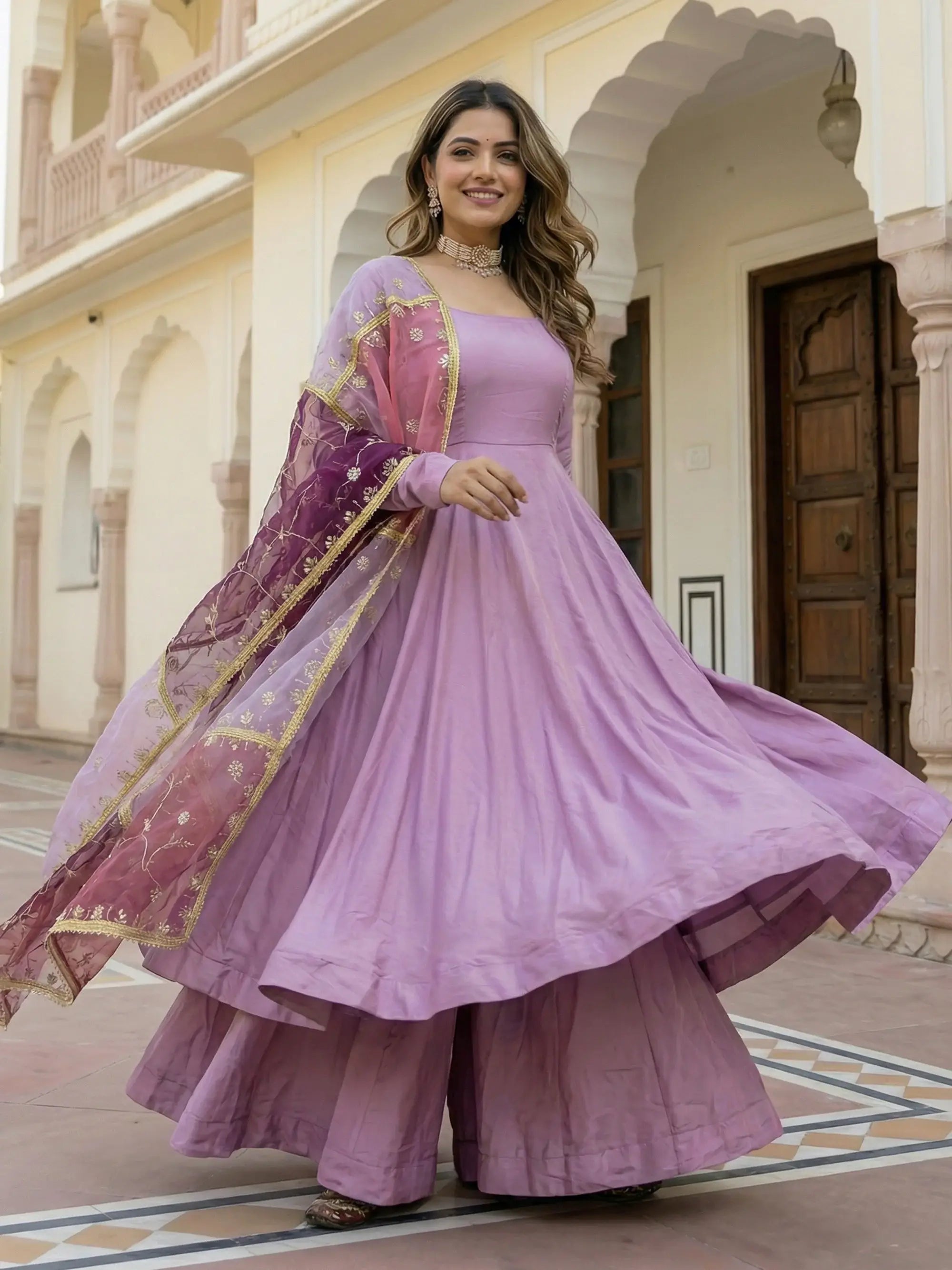 This elegant lavender suit set features a premium Roman Simmer Silk top, stitched with a flattering fit and luxurious fall. The square neckline and full sleeves enhance its graceful and modern appeal.