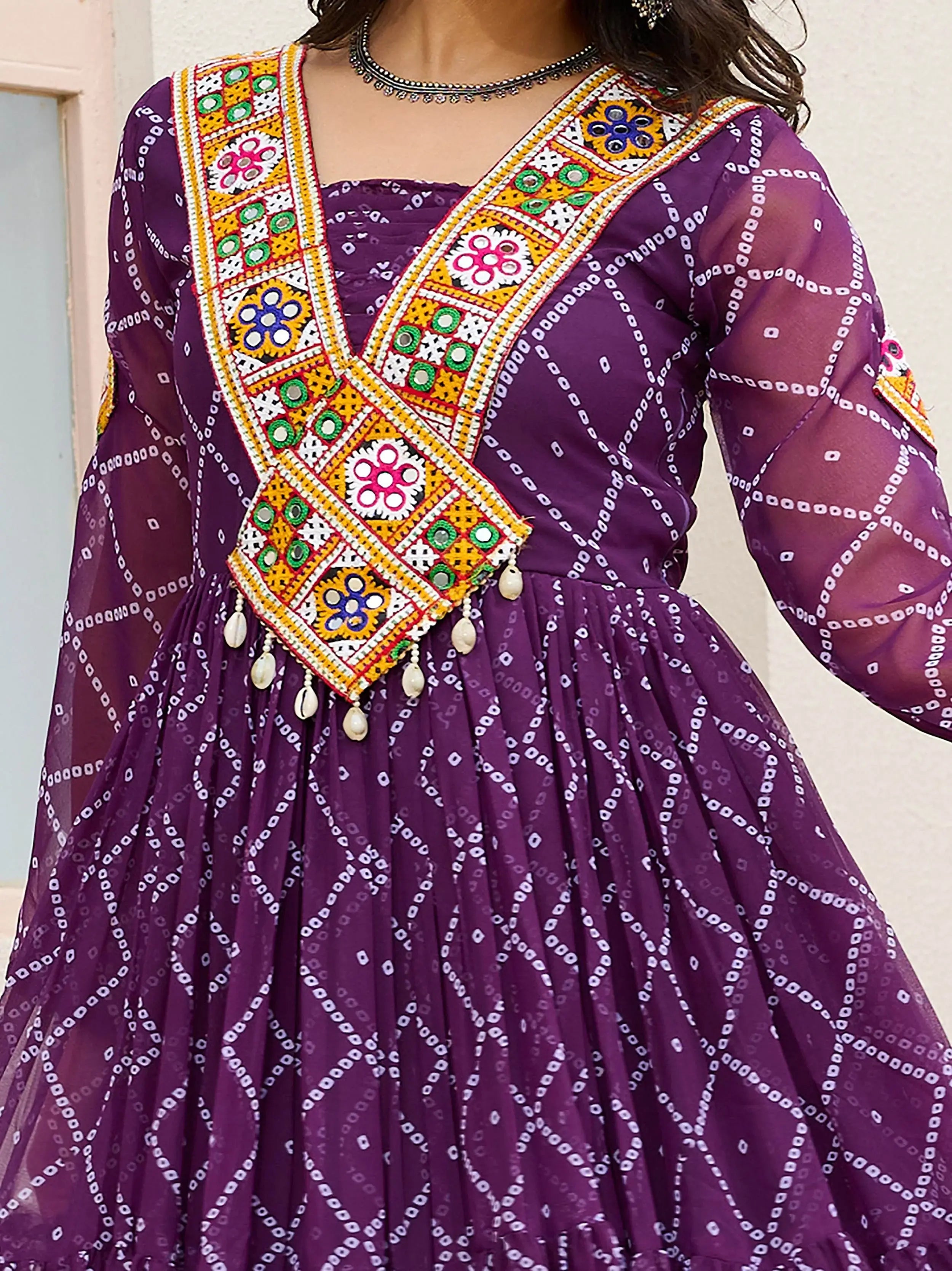 This stunning faux georgette gown features a rich purple Bandhani print, beautifully complemented with intricate Kutchi patchwork. The detailed embroidery is enhanced with shell embellishments, adding a traditional yet chic charm.
