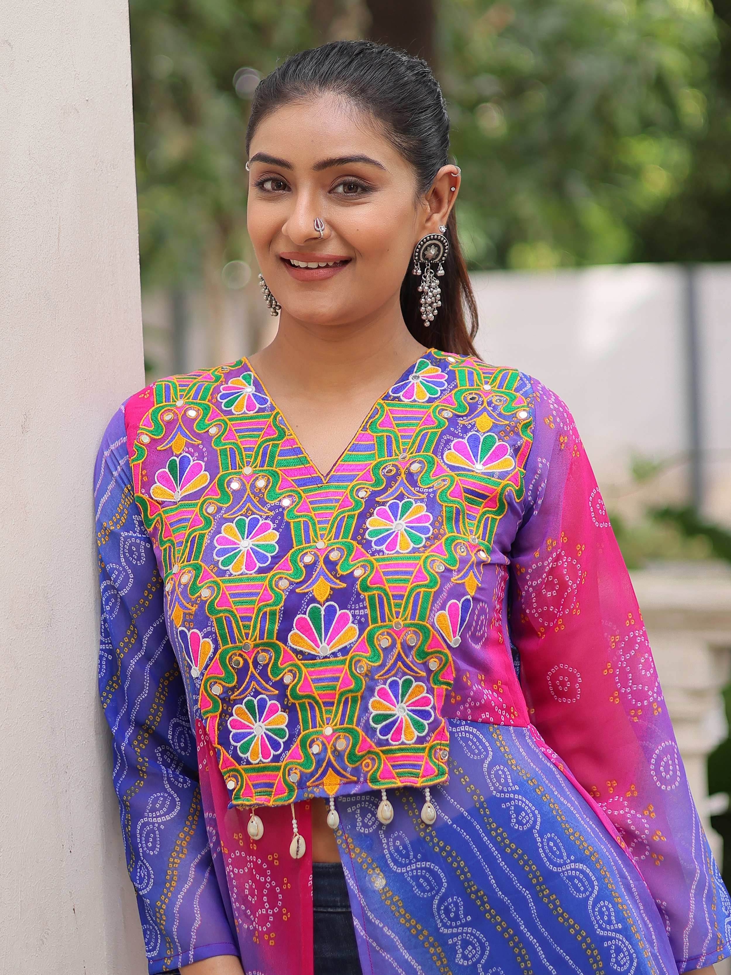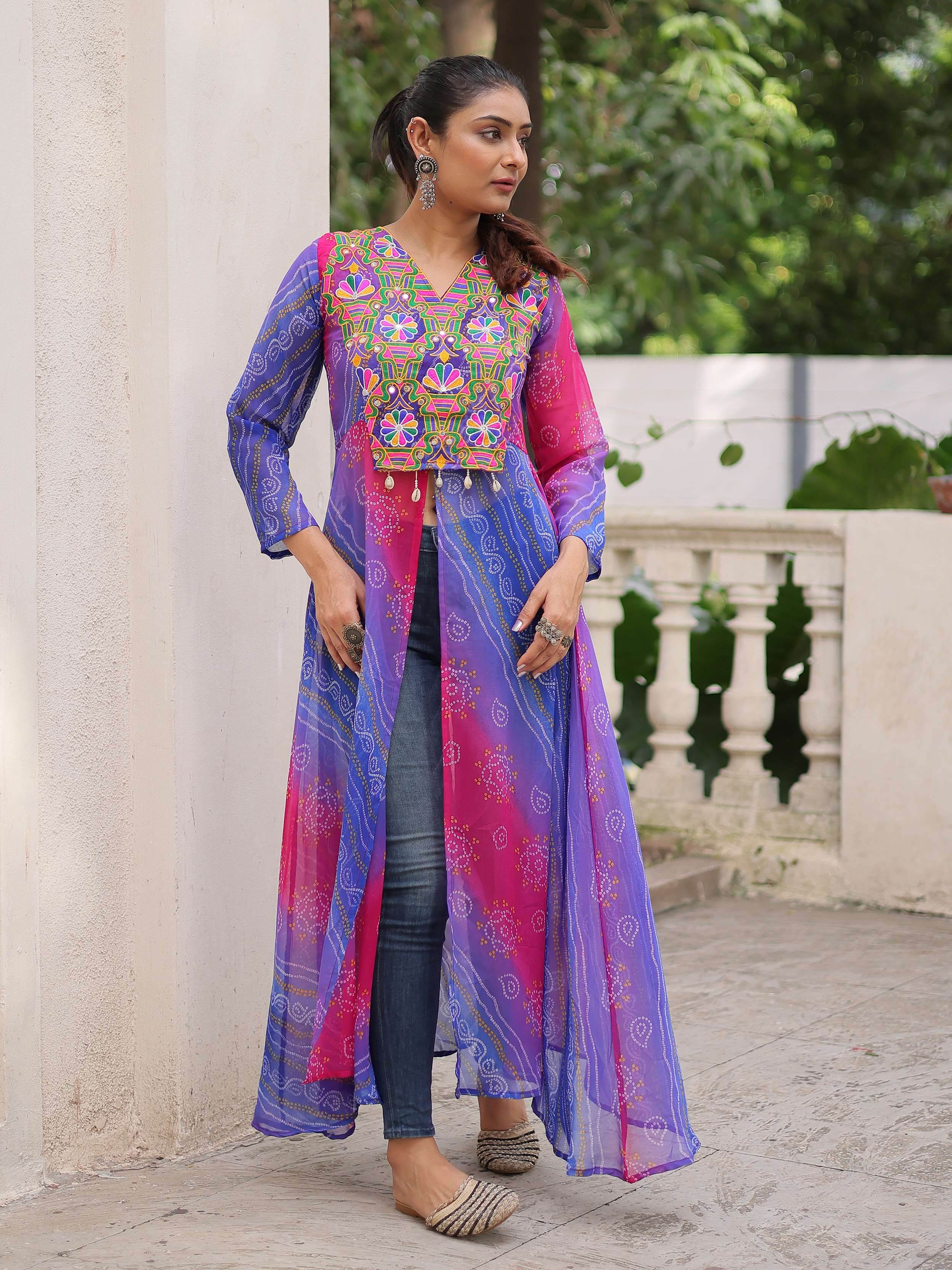 This vibrant faux georgette kurti showcases a striking Bandhani print in shades of purple, pink, and blue, exuding festive charm. The front panel is adorned with intricate Kutchi patchwork in multicolor threads, highlighted by floral motifs and delicate bead hangings for an ethnic appeal.