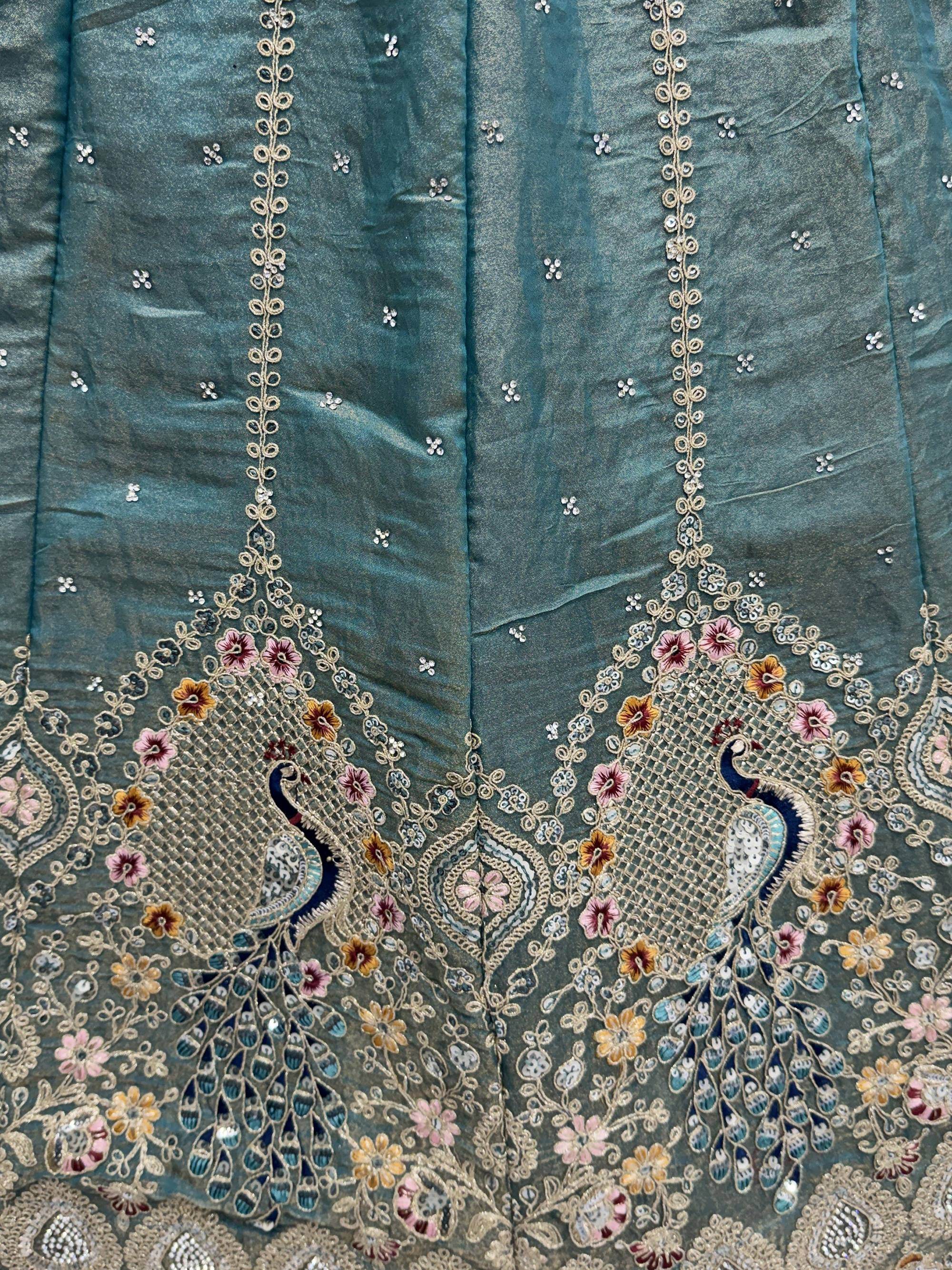 This stunning lehenga comes in a rich teal blue Gadhwal silk with beautiful peacock embroidery. It features detailed dori work, sequins work, and zircon diamond highlights that add a festive shine.