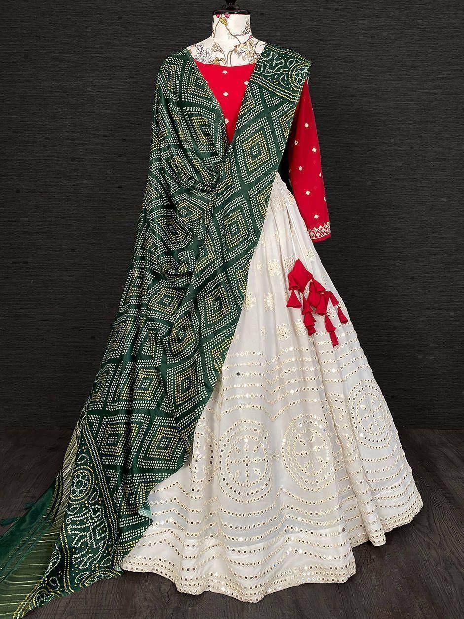 This lehenga comes with red color choli in georgette material with sequins and thread embroidery work has done and green color original gaji silk dupatta designed by bandhej digital print and attached with tassels on the border also.