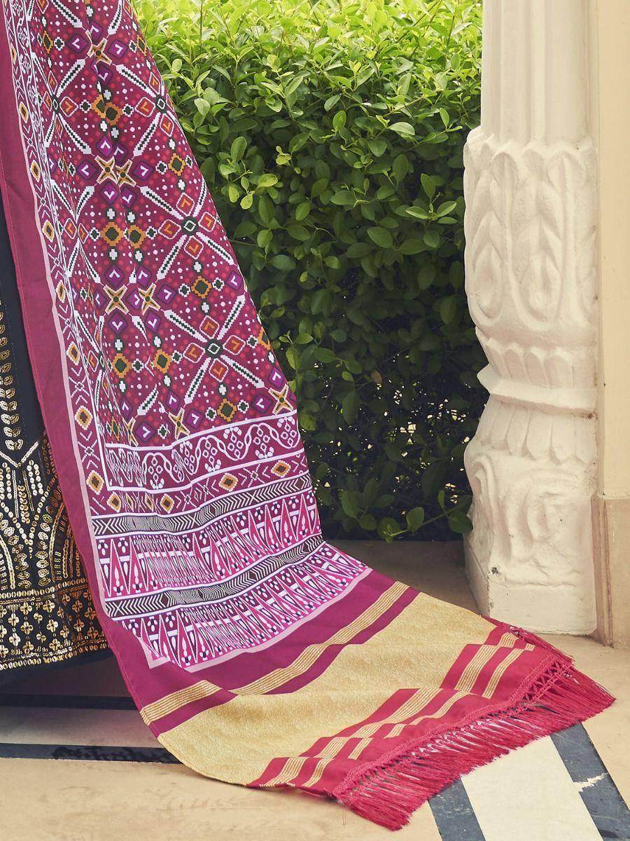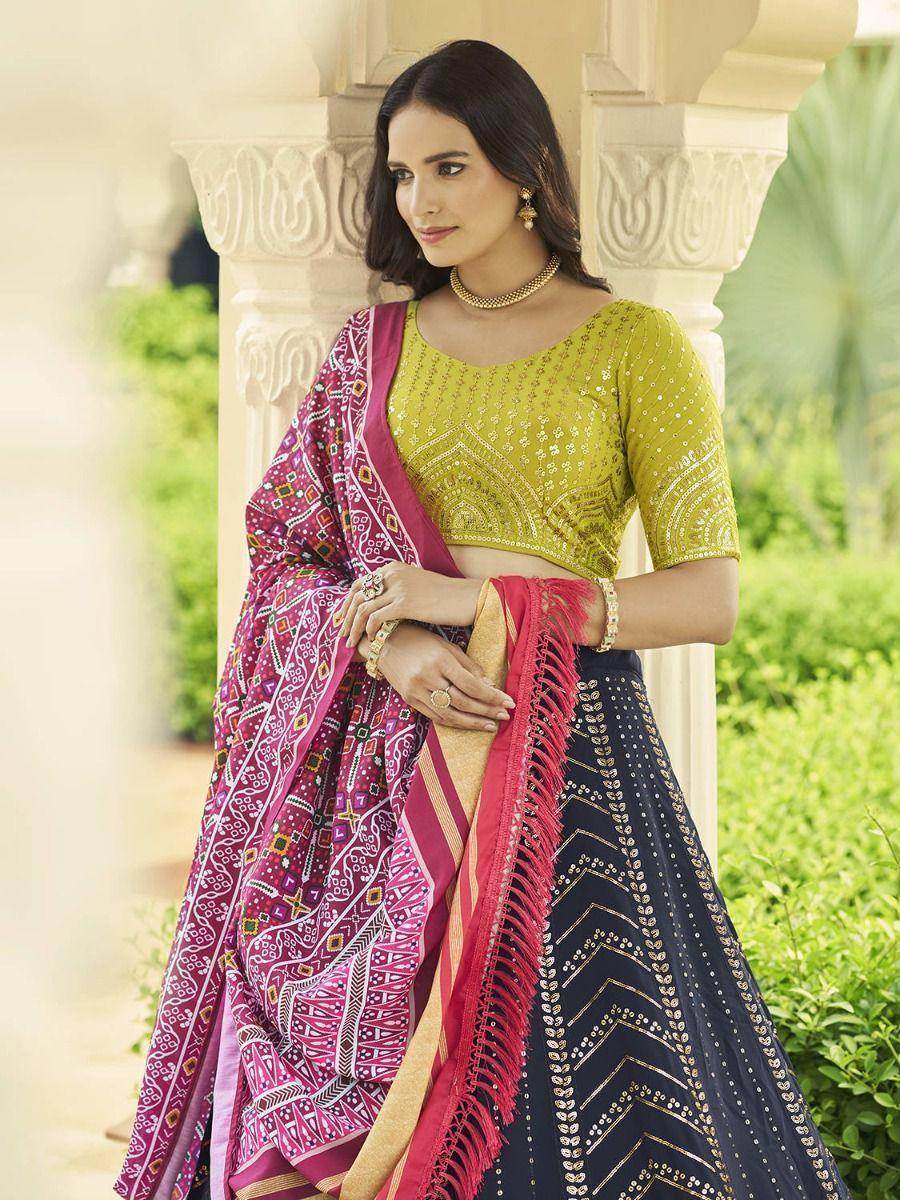 This stunning lehenga comes with a dark pink color choli in georgette material beautified with floral sequins embroidered work and a green color printed dupatta made of gajji silk material and featured with beautiful heavy tassel on dupatta corner and sequence lace border work.