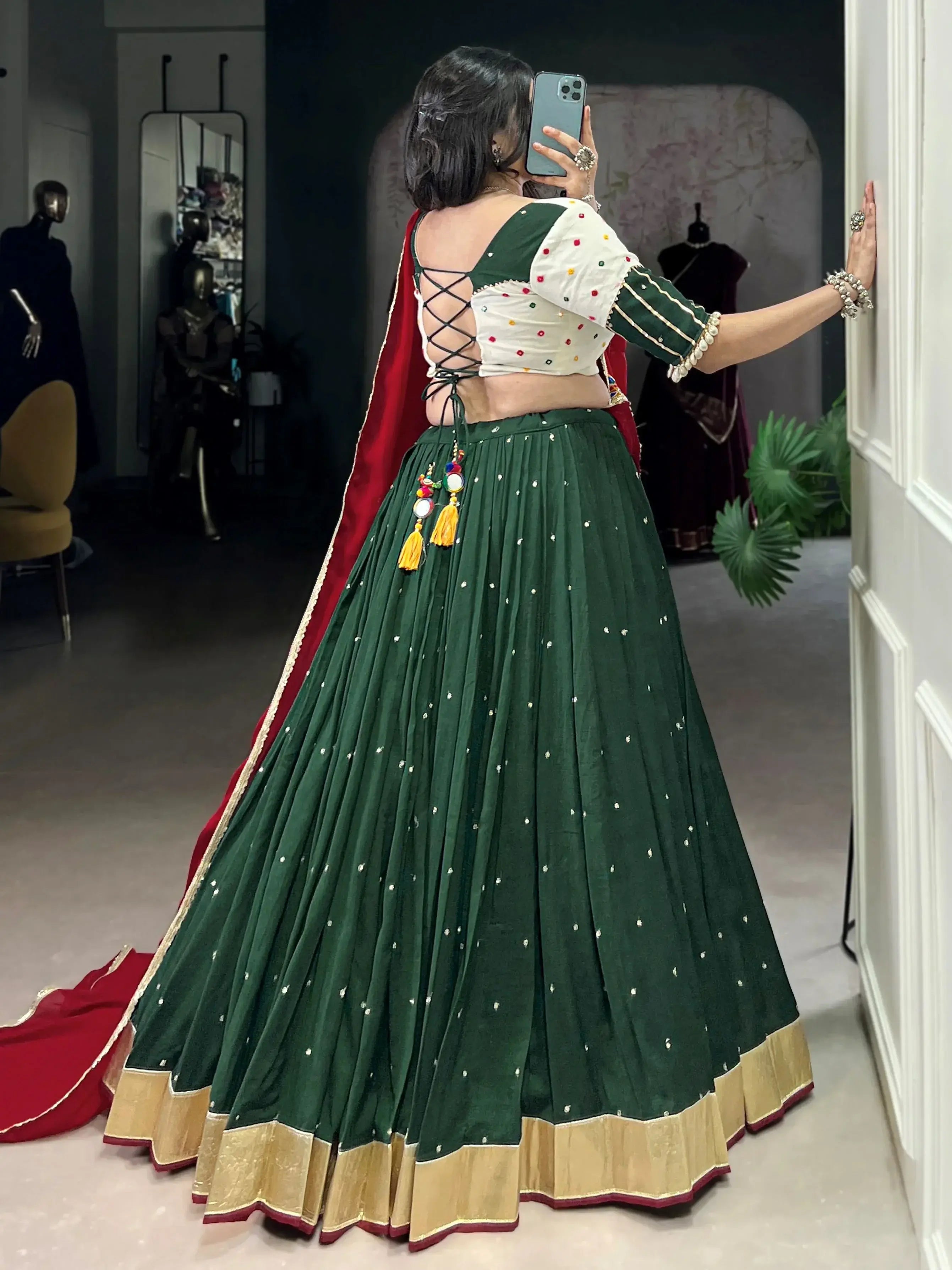 A rich Chinon dupatta completes the ensemble, adorned with matching mirror Gamthi work and bordered with intricate lace. The 2.5-meter length drapes gracefully to elevate the overall look.