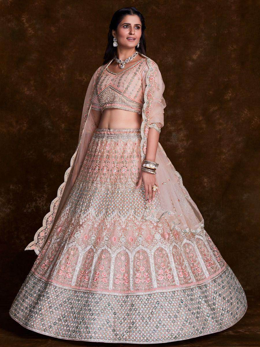 In summary, the "Delightful Peach Thread Embroidered Soft Net Bridal Lehenga Choli" is a beautiful and versatile outfit that is perfect for weddings, Bollywood-themed parties, and other festive occasions. Crafted from soft net fabric with intricate thread work, zari work, and zarkhan diamond work, this lehenga choli exudes elegance and grace. With its semi-stitched design and customizable options, it offers a perfect fit for different body types. The A-line silhouette, half sleeve, and V-shaped neck design add to its appeal. Invest in this stunning lehenga choli and make a lasting impression wherever you go.