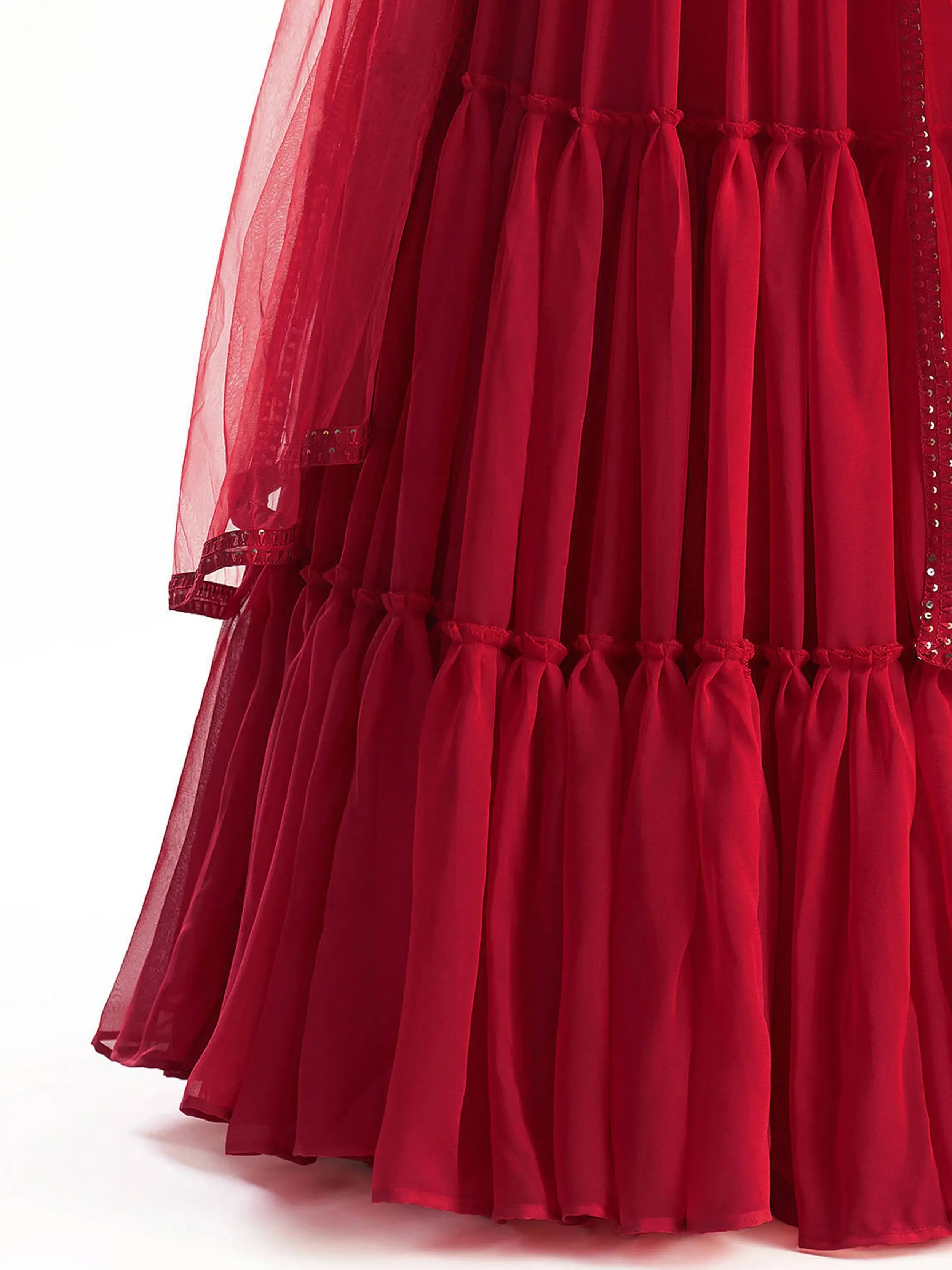 Complementing the lehenga is a choli in a similar shade of red, embellished with intricate georgette material. The choli features stunning embroidery and sequin work, adding a touch of glamour and sophistication. It comes fully unstitched, allowing you to customize it to your desired fit and style.
