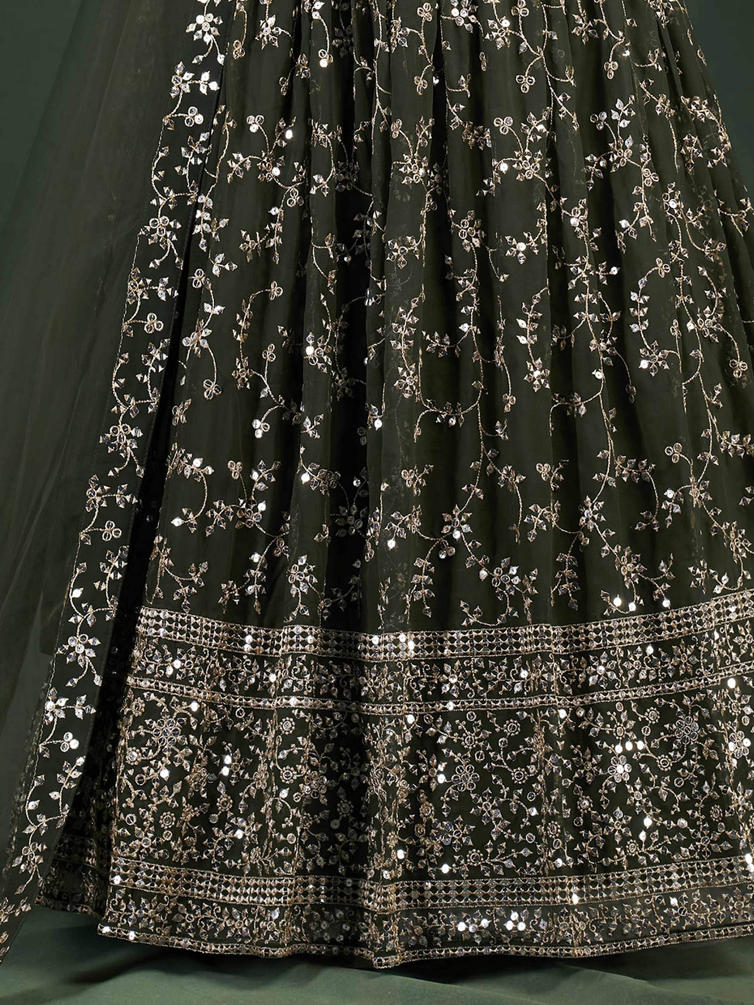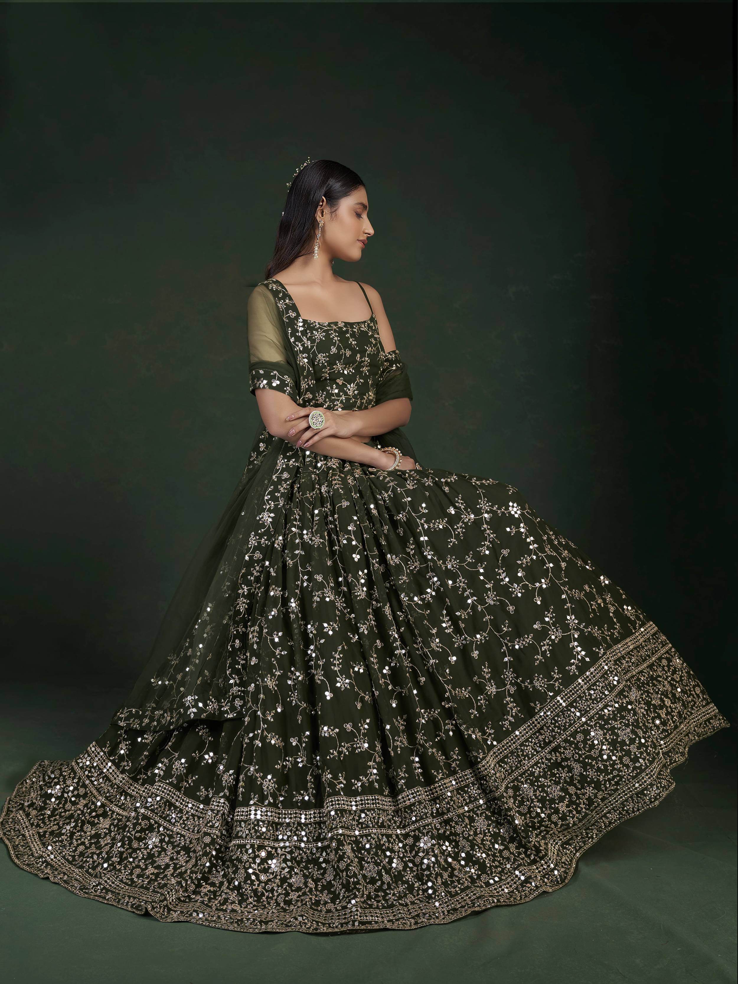 Be the sunshine of everyone's eyes dressed in this olive green color lehenga crafted with georgette material accomplished with sequins work and zari work.
