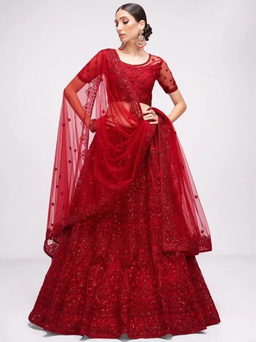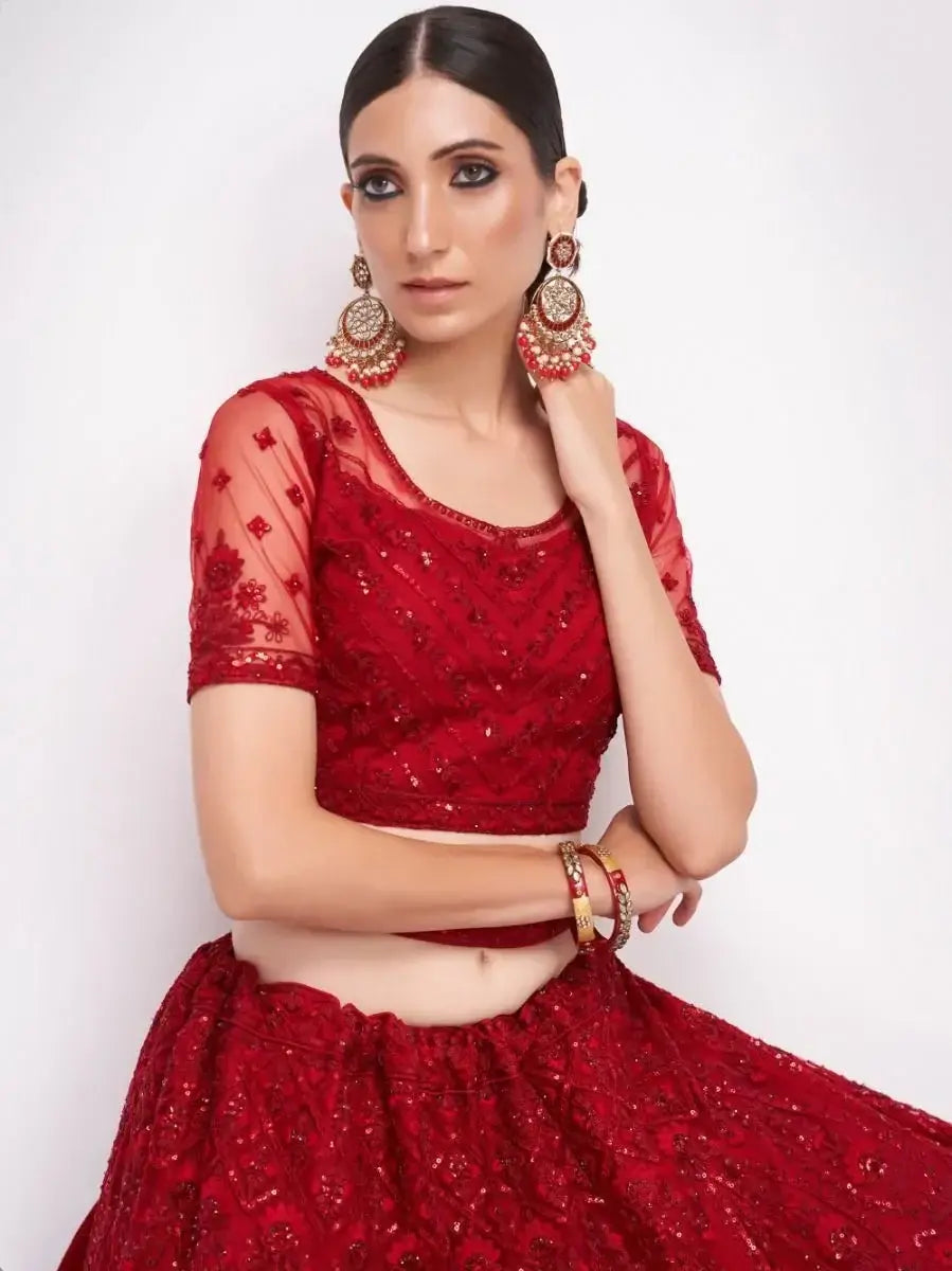 Bring up your party looks by adding this luxuriant red-colored net with silk inner material lehenga designed with exquisite cording, thread, sequins embroidery, and stonework. This lehenga comes with an embroidered belt.