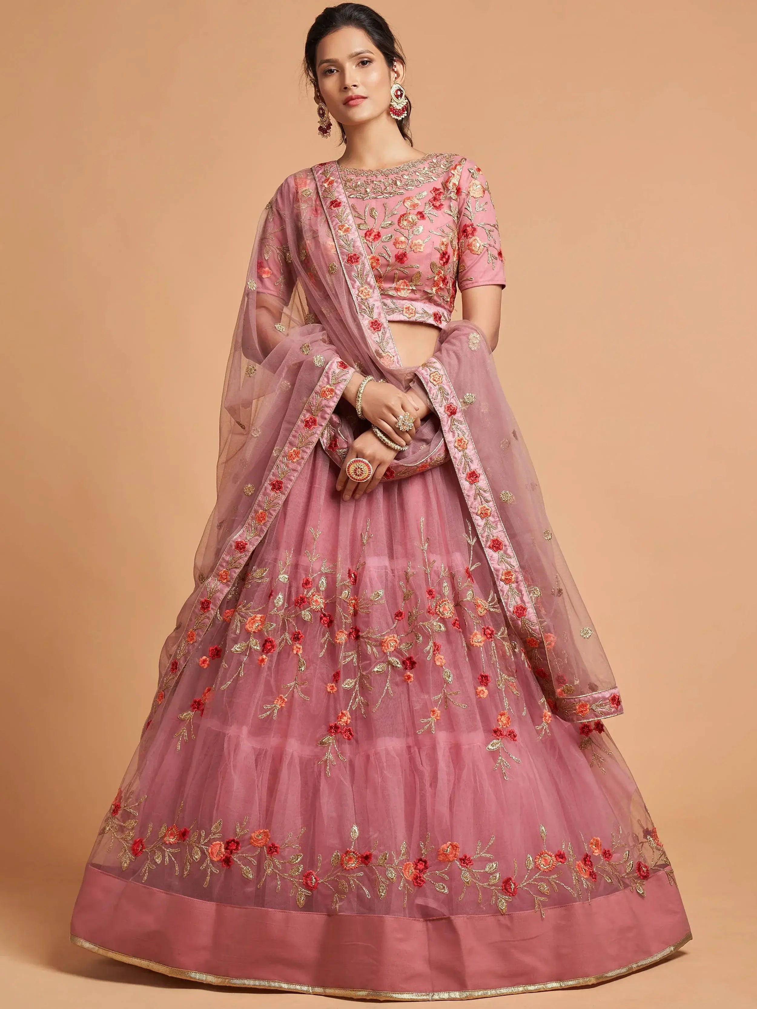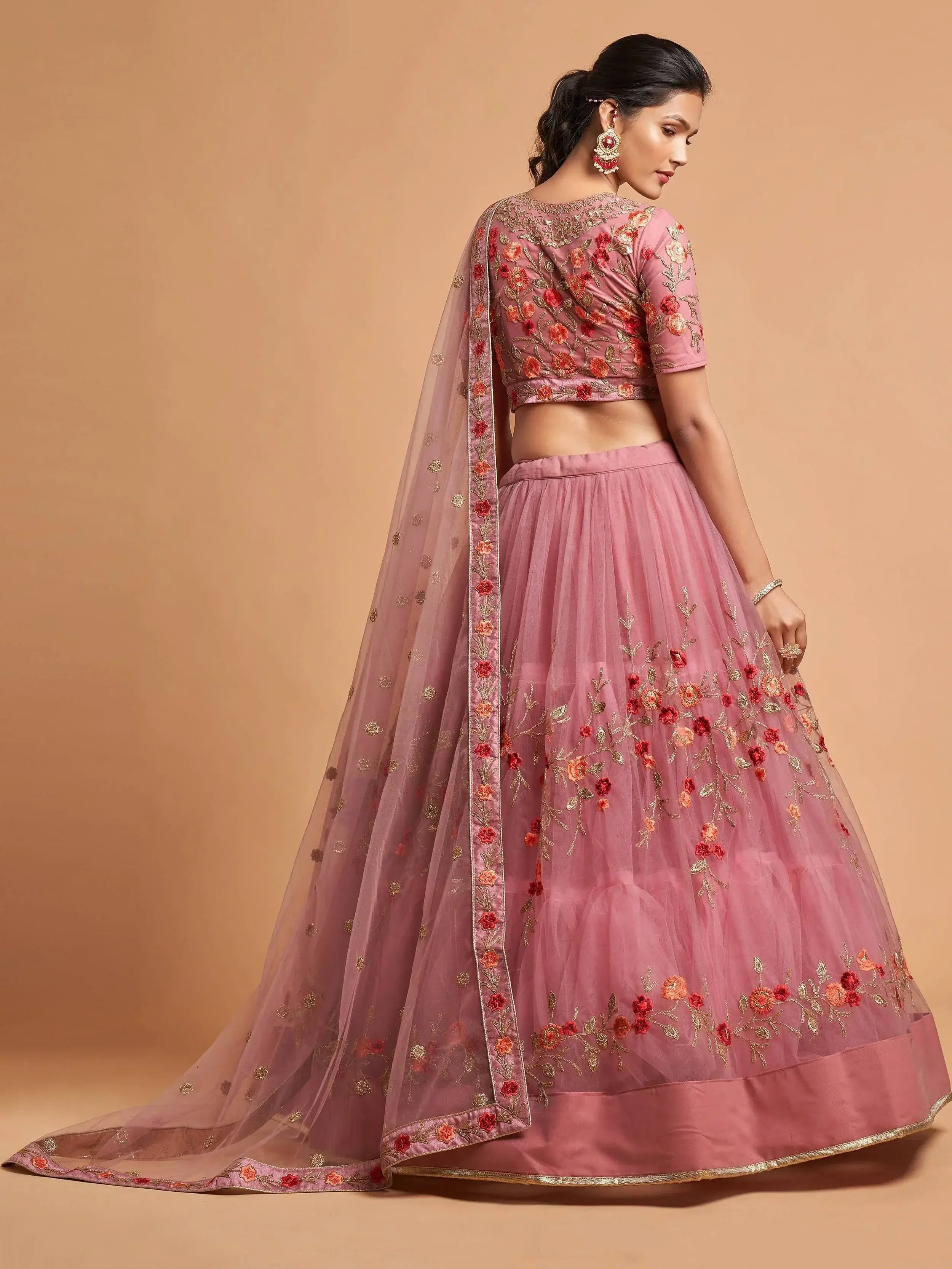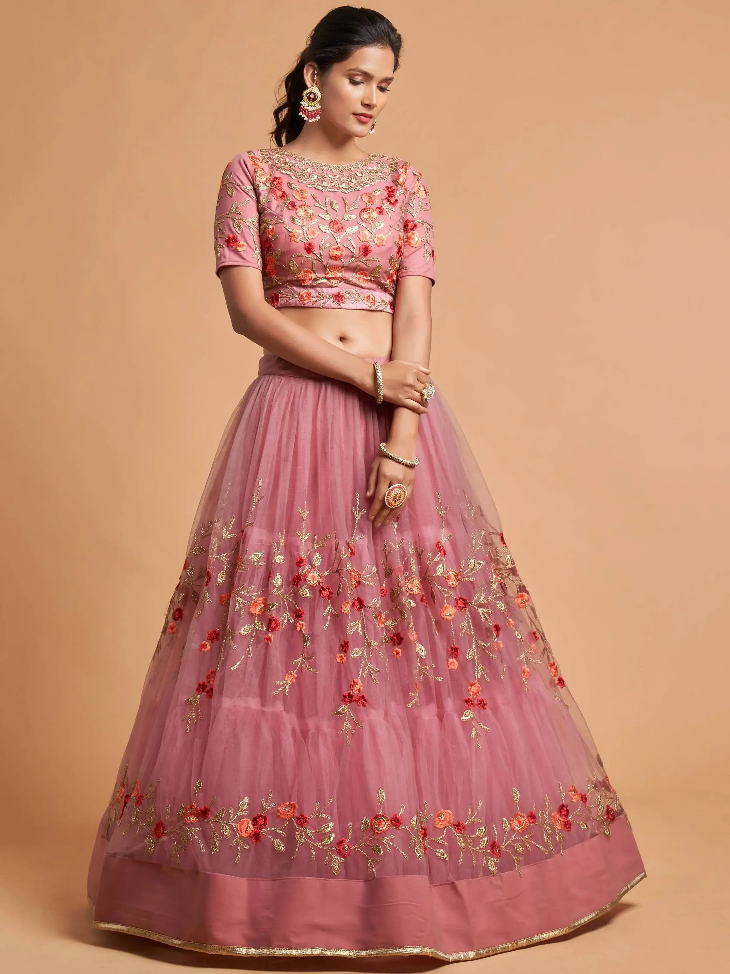 With this Designer Dusty Pink Lehenga Choli for Wedding Occasions, find grace at its best. Made from opulent net fabric, this outfit radiates elegance and refinement, so perfect for any bride or visitor trying to create a classy impression. The complex thread embroidery accentuates the elegance of the dress by matching its calm dusty pink hue.