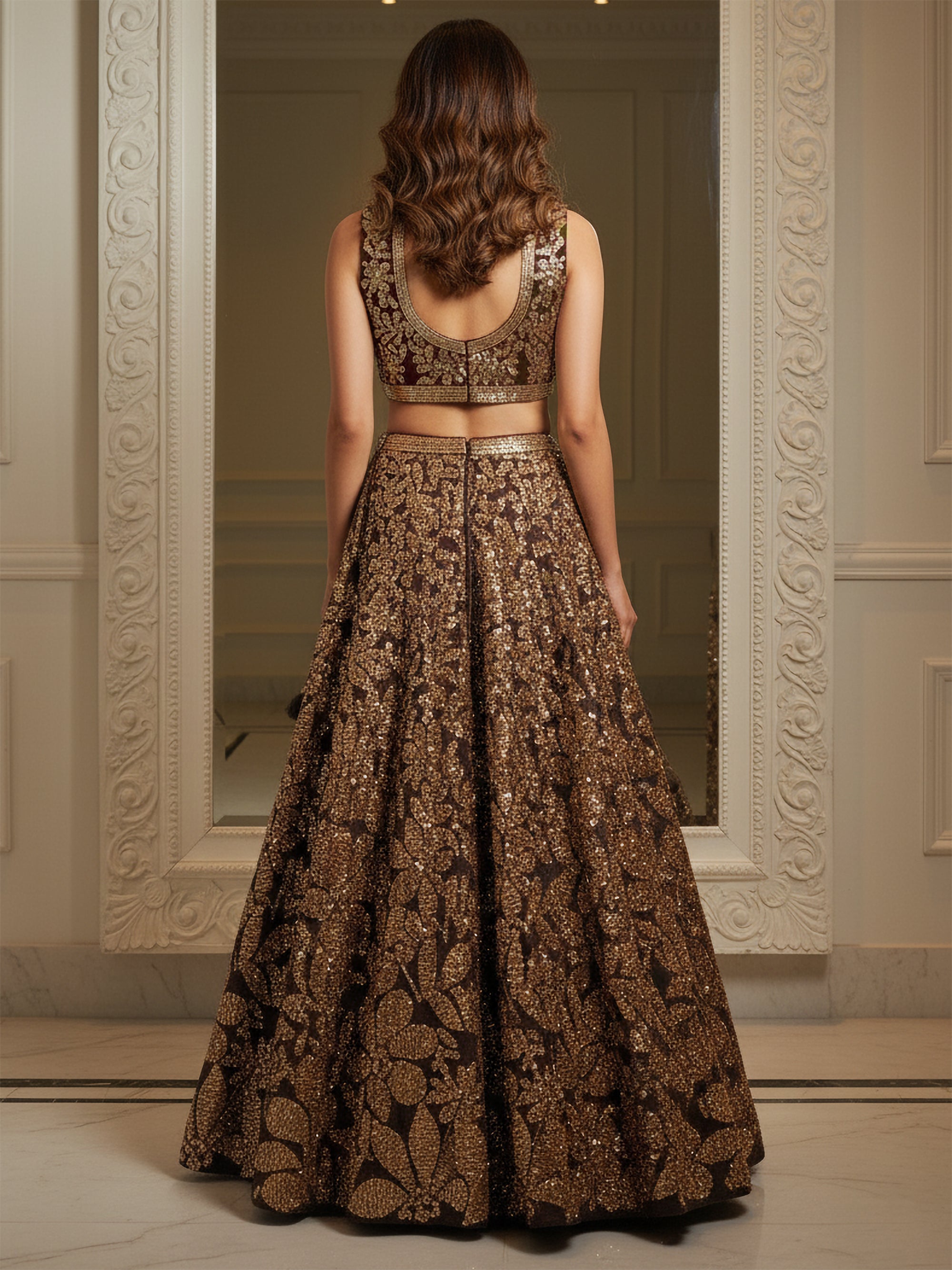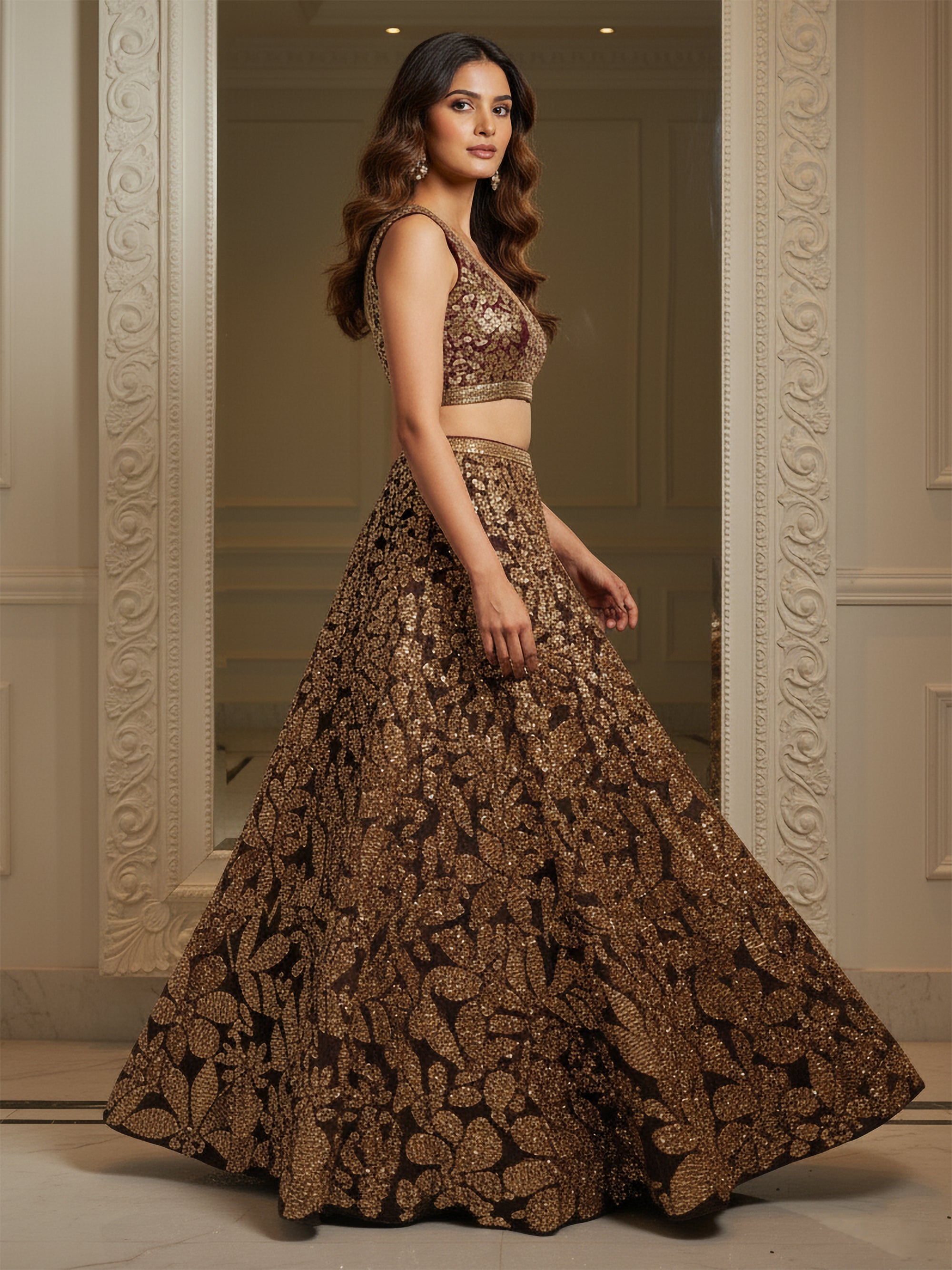 This breathtaking soft net lehenga set showcases the artistry of sequins embroidered work, blending glamour with grace. The shimmering golden embroidery over a deep base creates a stunning statement look, ideal for evening galas and festive celebrations.