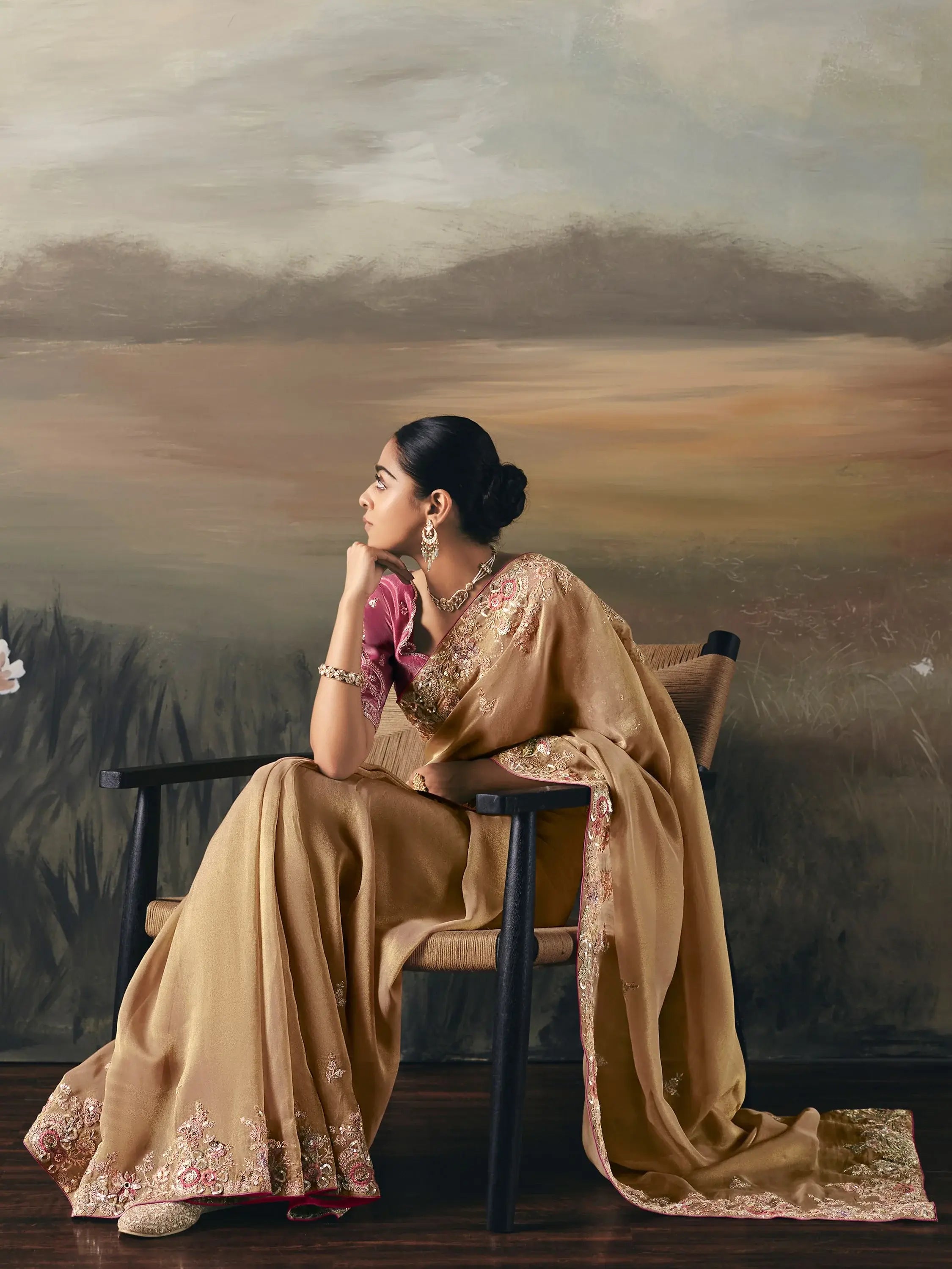 This cream silk saree exudes timeless sophistication with its soft and luxurious drape. The rich sheen of the fabric beautifully complements the intricate detailing across the ensemble.