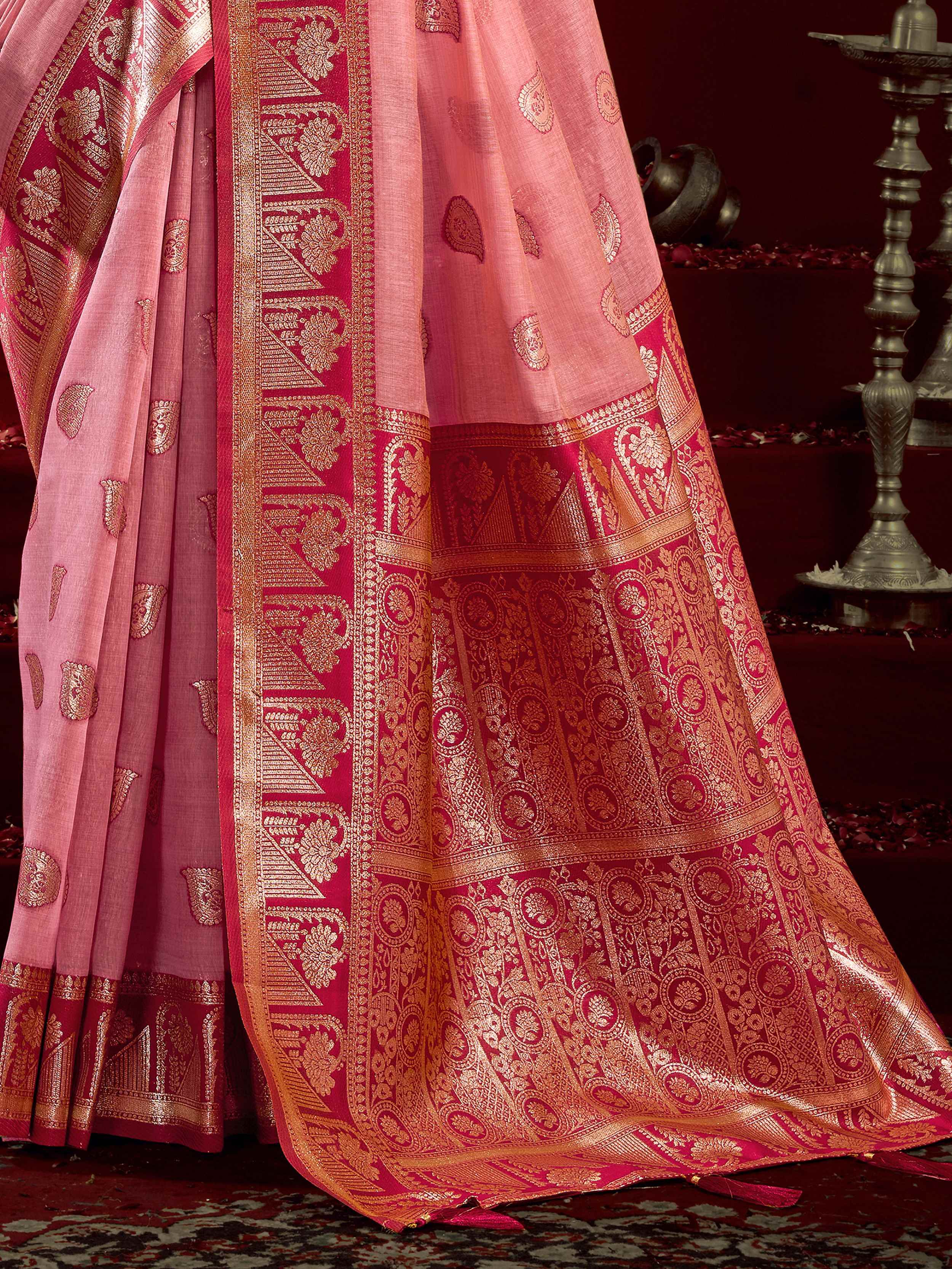 This elegant saree is crafted in a soft rose-pink shade using rich Banarasi silk, giving it a graceful and feminine appeal. It is beautifully adorned with intricate zari weaving featuring traditional motifs across the body, border, and pallu, adding a luxurious sheen.