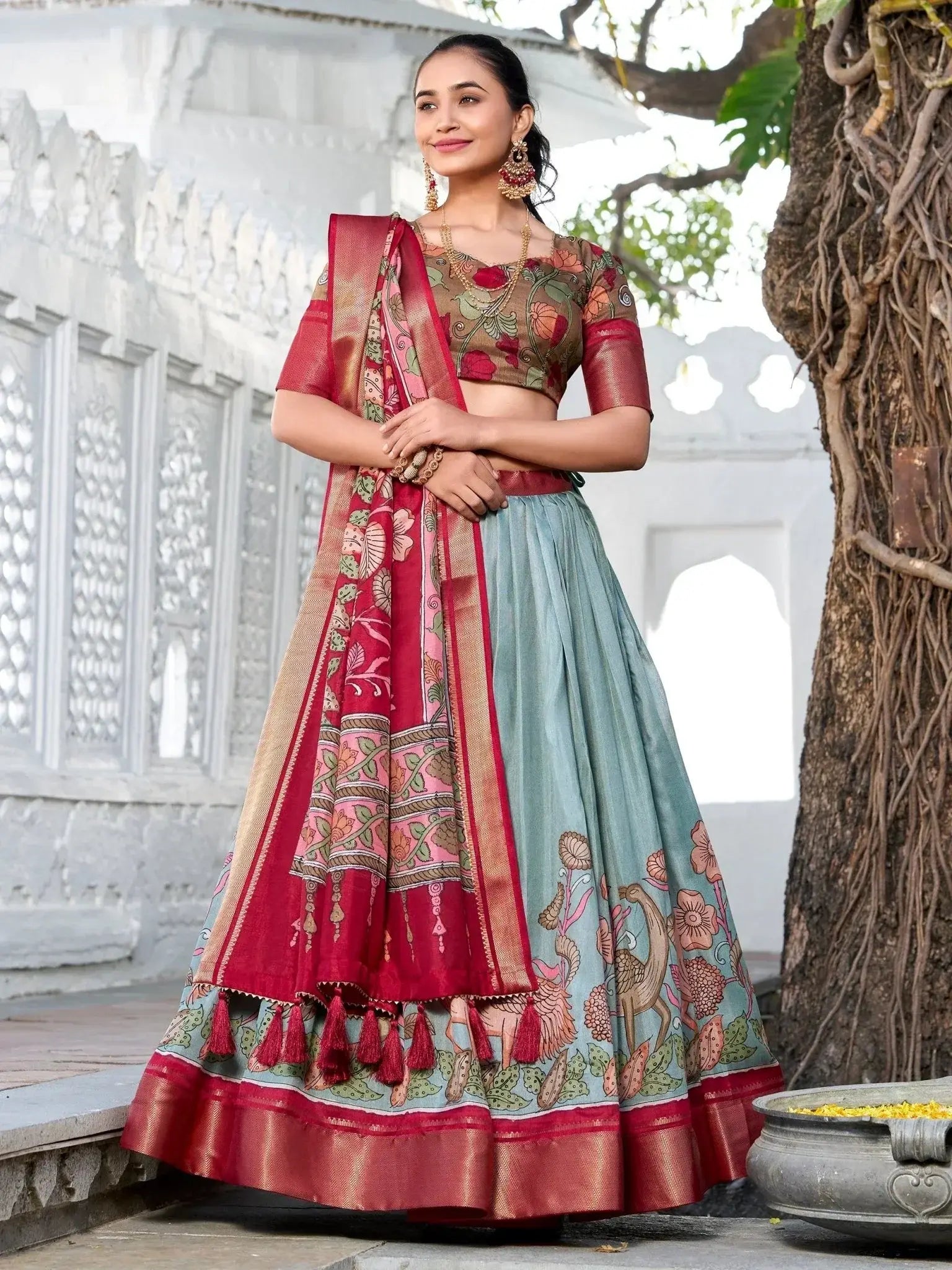 Step into festive elegance with this stunning sea green dola silk lehenga, beautifully adorned with traditional Kalamkari prints and a rich zari weaving border. The soothing color and intricate detailing make it a perfect pick for celebrations and cultural events.