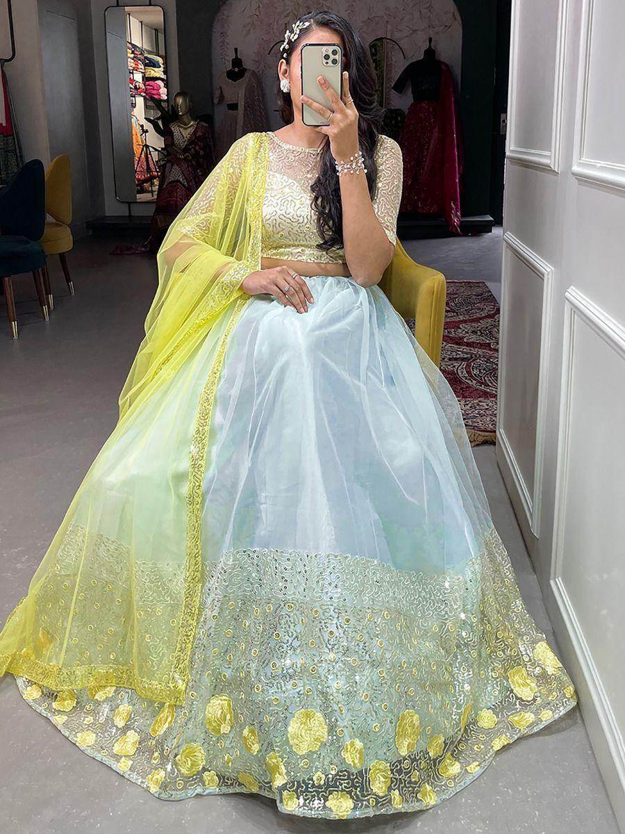 The elegant designer lehenga choli is a classic number that deserves all attention crafted on net material in sky-blue color embellished by lemon yellow color sequins and embroidery to flaunt it beauty.