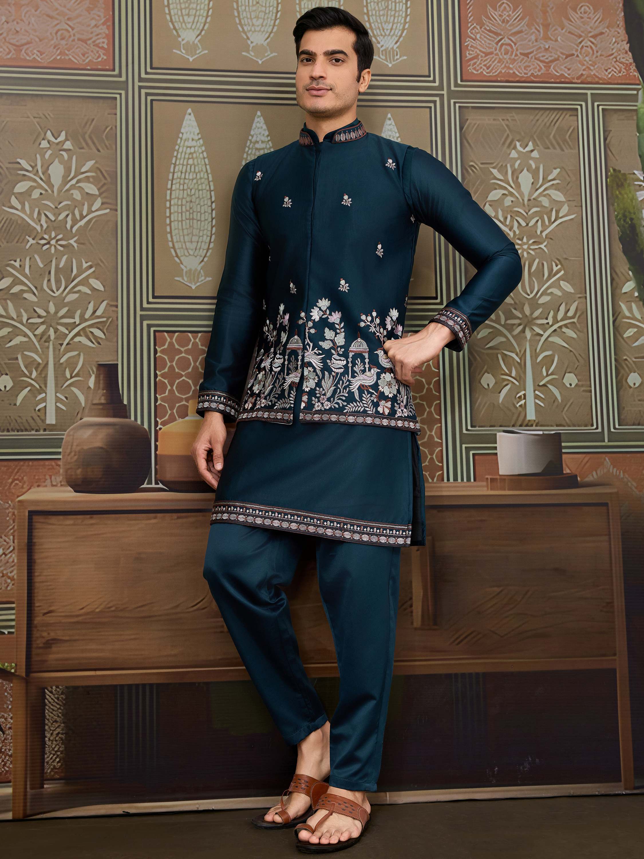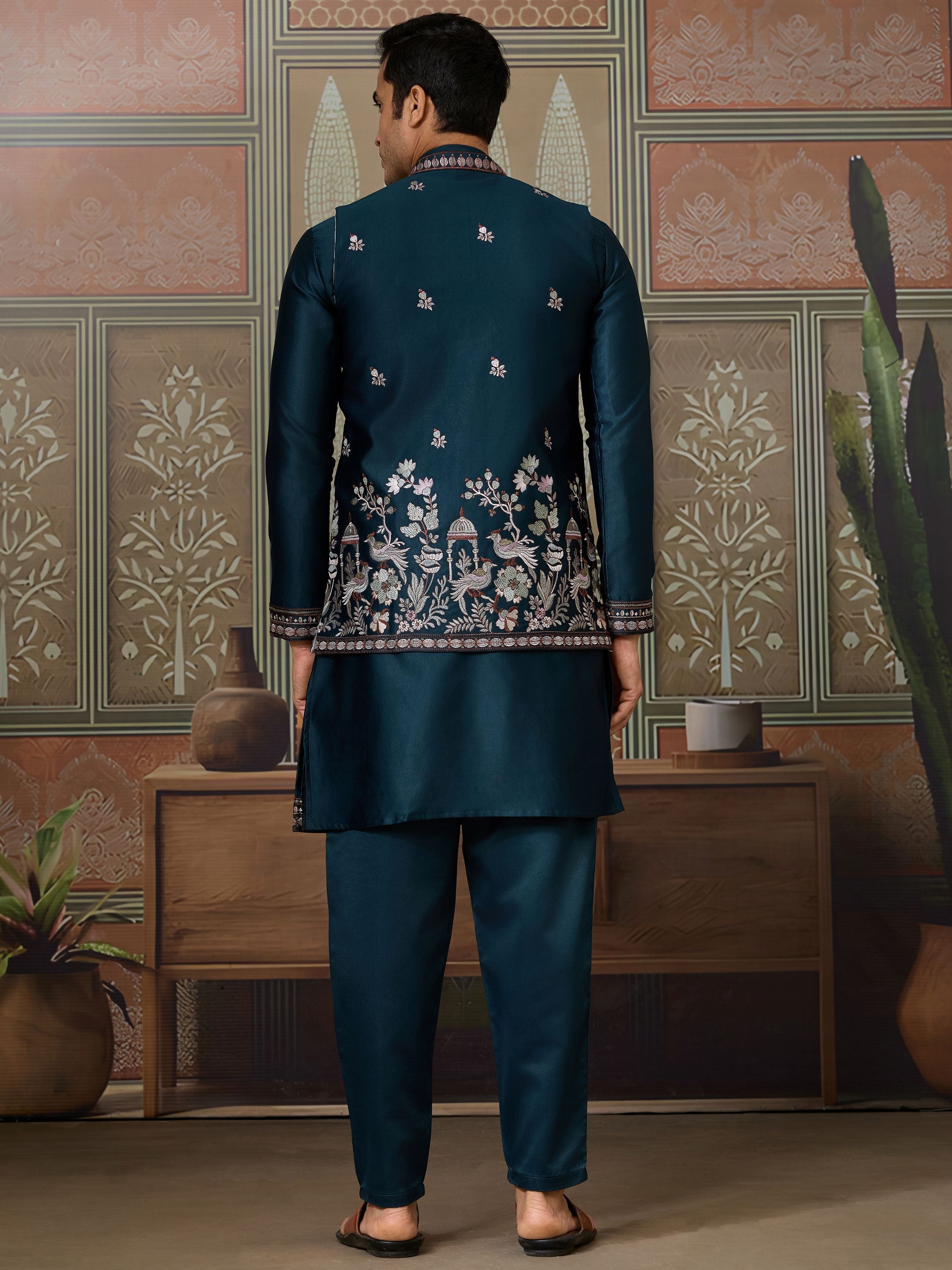 This teal blue silk kurta set in a deep teal hue is a statement of elegance and modern sophistication. The front features intricate thread embroidery depicting Mughal-inspired motifs of florals and birds, accentuating its regal charm.