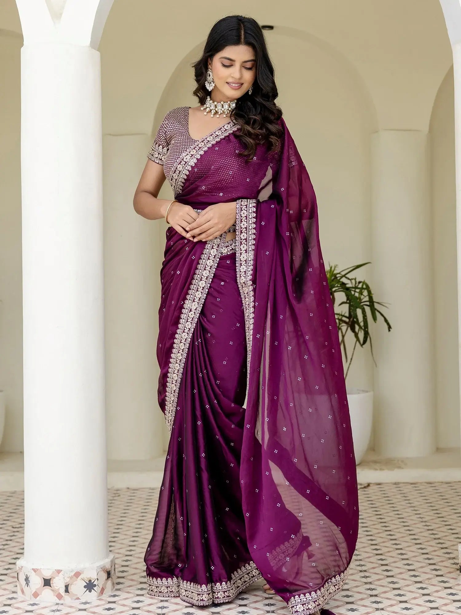 The saree is adorned with tiny sequin motifs across the body, adding a subtle sparkle to its rich, lustrous base. A complementing waist belt detail adds structure and a contemporary twist to the traditional silhouette.