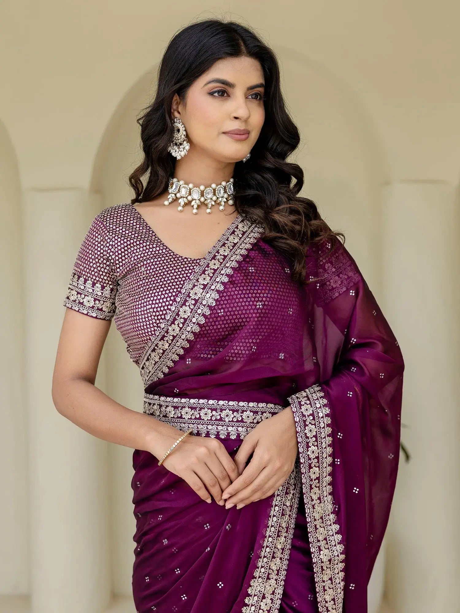 This luxurious silk saree in a deep wine hue showcases intricate zari, dori, 4-mm sequins, and foil work for a regal festive appeal. The blouse features heavy embellishments, enhancing the elegance of the drape, while the border boasts delicate floral patterns with shimmering accents.