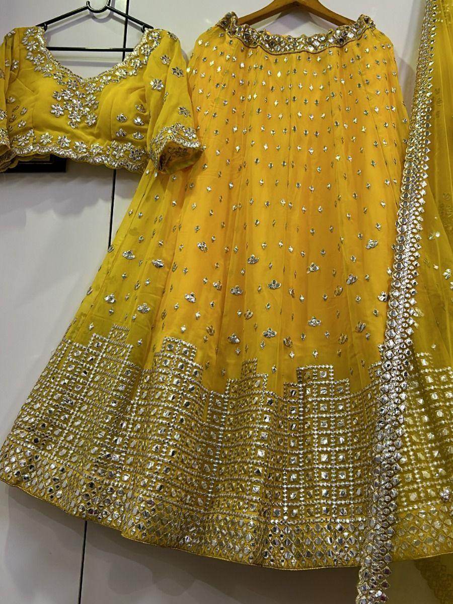What truly sets this ensemble apart is the stunning paper mirror work adorning both the front and back sides of each piece. The elegant craftsmanship and intricate designs shine bright, adding a touch of glamour to your overall appearance. You are guaranteed to be the center of attention at any special occasion or haldi function when you wear this mesmerizing lehenga choli set.