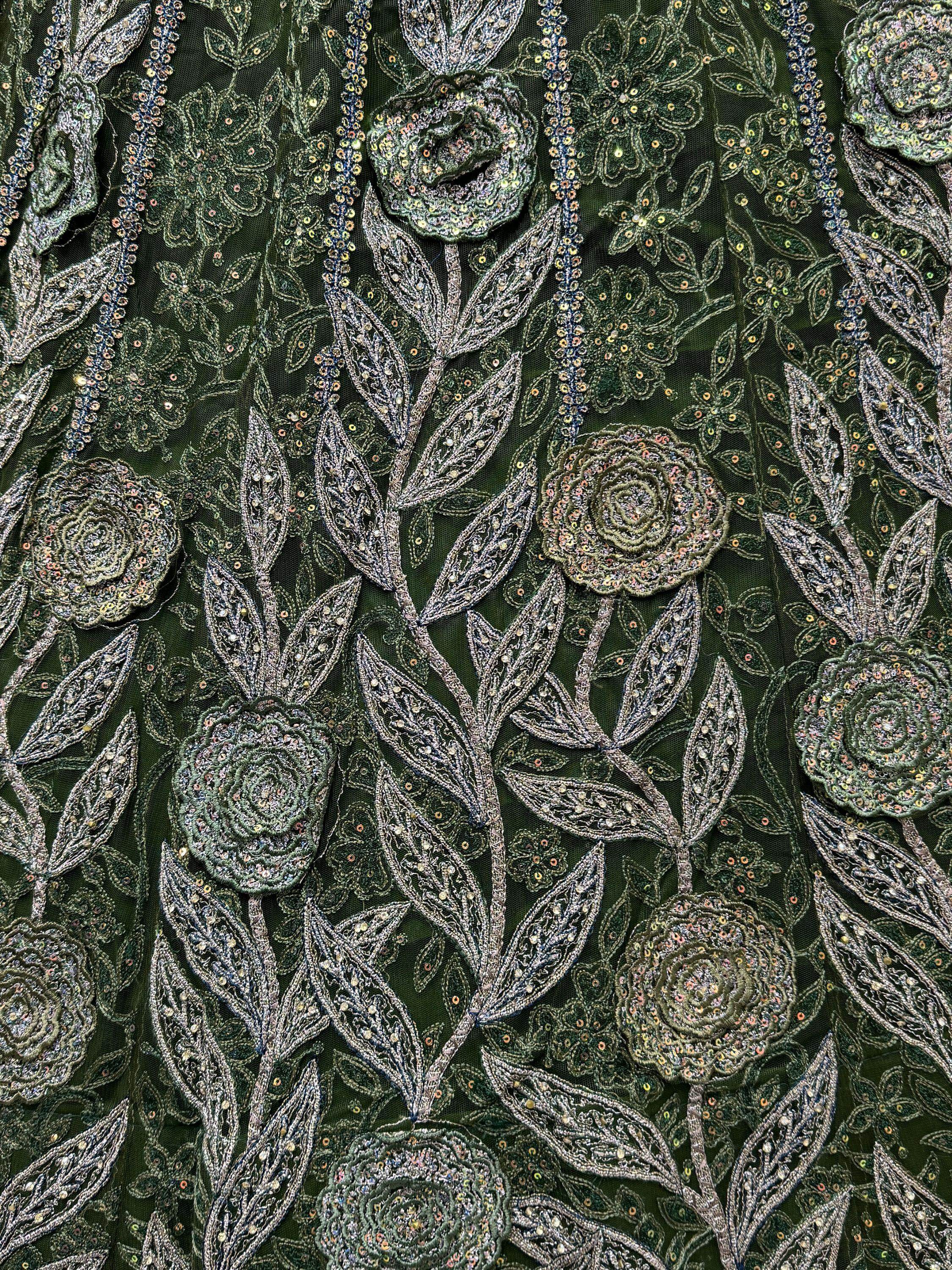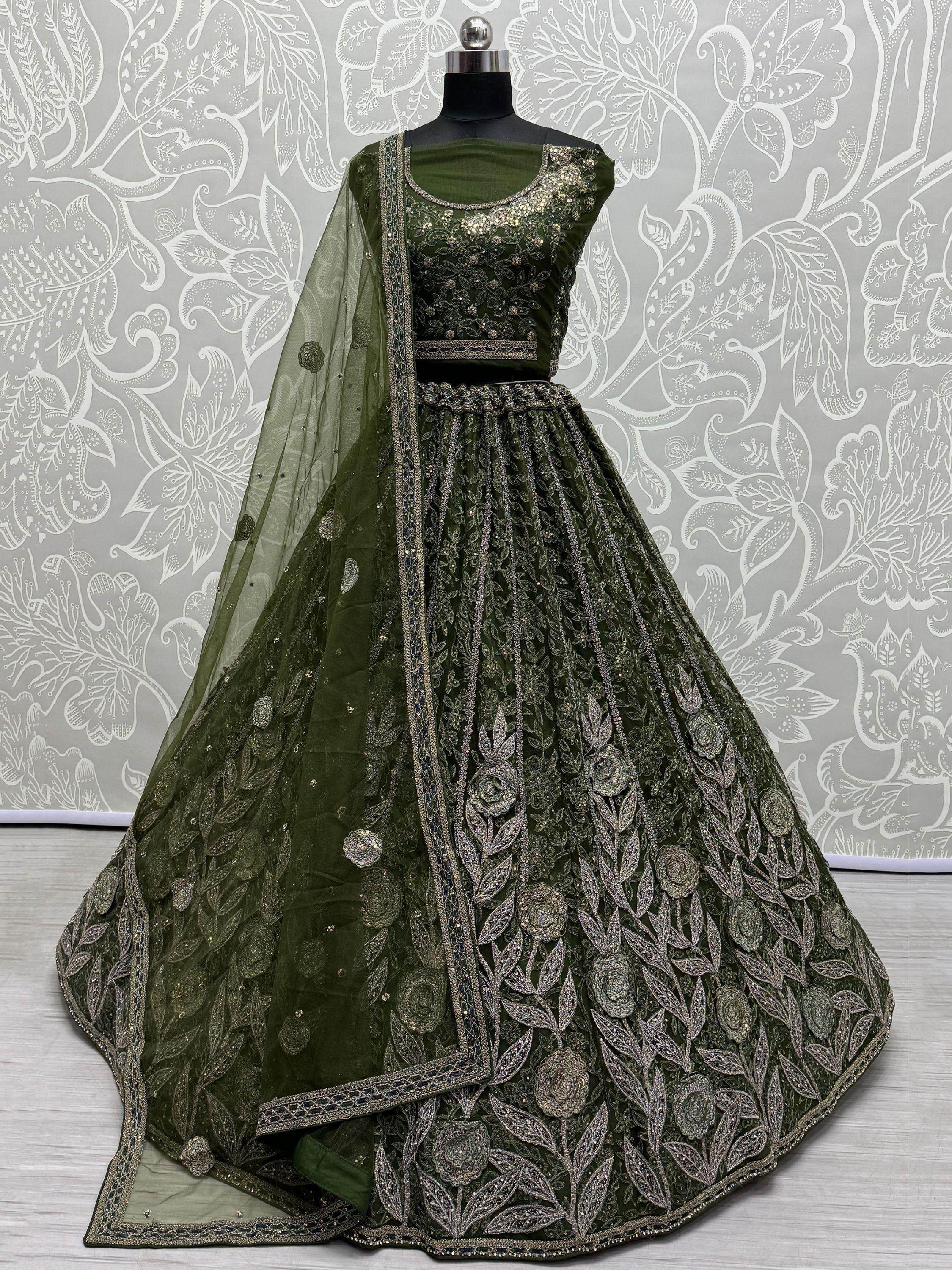 Mesmerizing green lehenga that captures the essence of timeless beauty and modern elegance. This stunning ensemble is crafted from premium net material, adorned with intricate zari embroidery, multi-thread fancy flower work, shimmering sequins, and delicate dori detailing. Each element of this lehenga is designed to create a captivating look, perfect for a bride who desires to blend tradition with contemporary style.