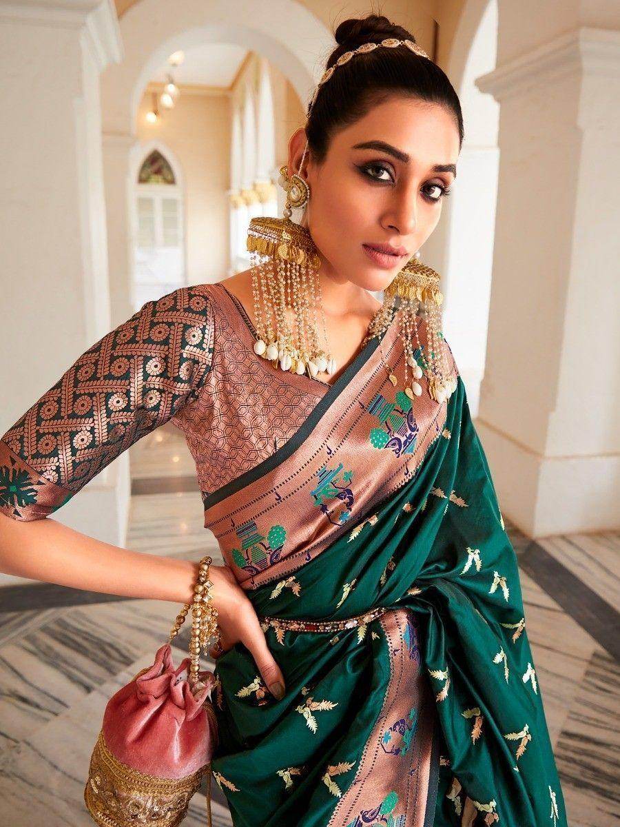 Add a touch of elegance and sophistication to your wardrobe with this enchanting green silk saree. Made from luxurious silk material, this saree features intricate zari weaving work, adding a touch of opulence to its overall look.