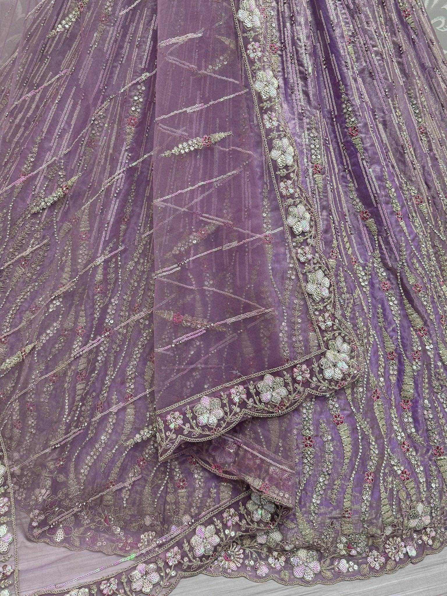 Completing this regal ensemble is a softnet dupatta, measuring 2.5 meters long. This dupatta is elegantly adorned with beautiful lace and an all-over butta pattern, adding a final touch of grace to the overall look. The lavender silk lehenga choli set is not just an outfit; it is a declaration of style and sophistication, ready to make you the center of attention at any celebration or gathering.