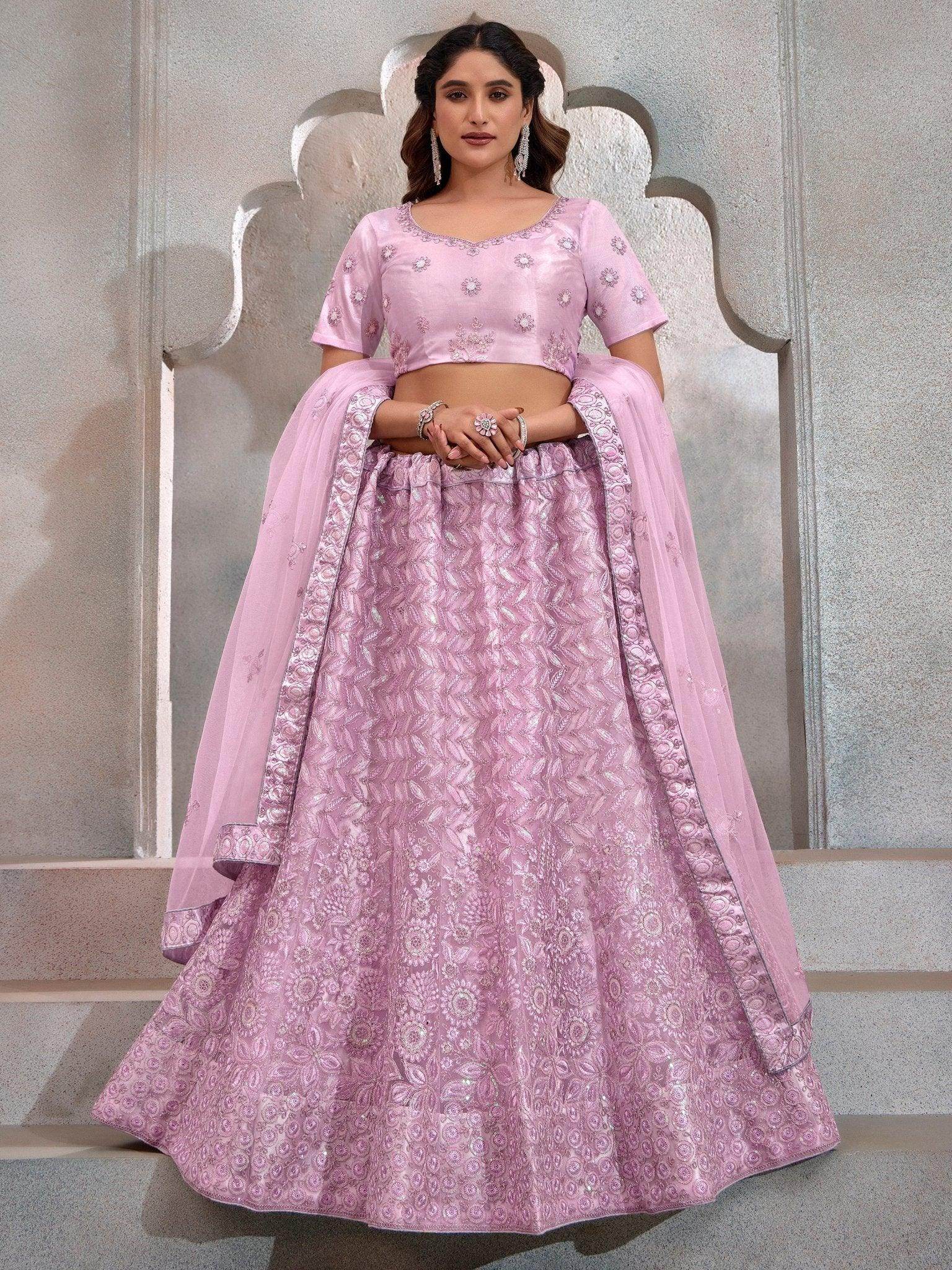 This stunning ensemble features a lavender color net lehenga adorned with intricate sequin work and delicate thread embroidery. The matching net choli is crafted with the same sequin work and thread embroidery, creating a cohesive and luxurious look.