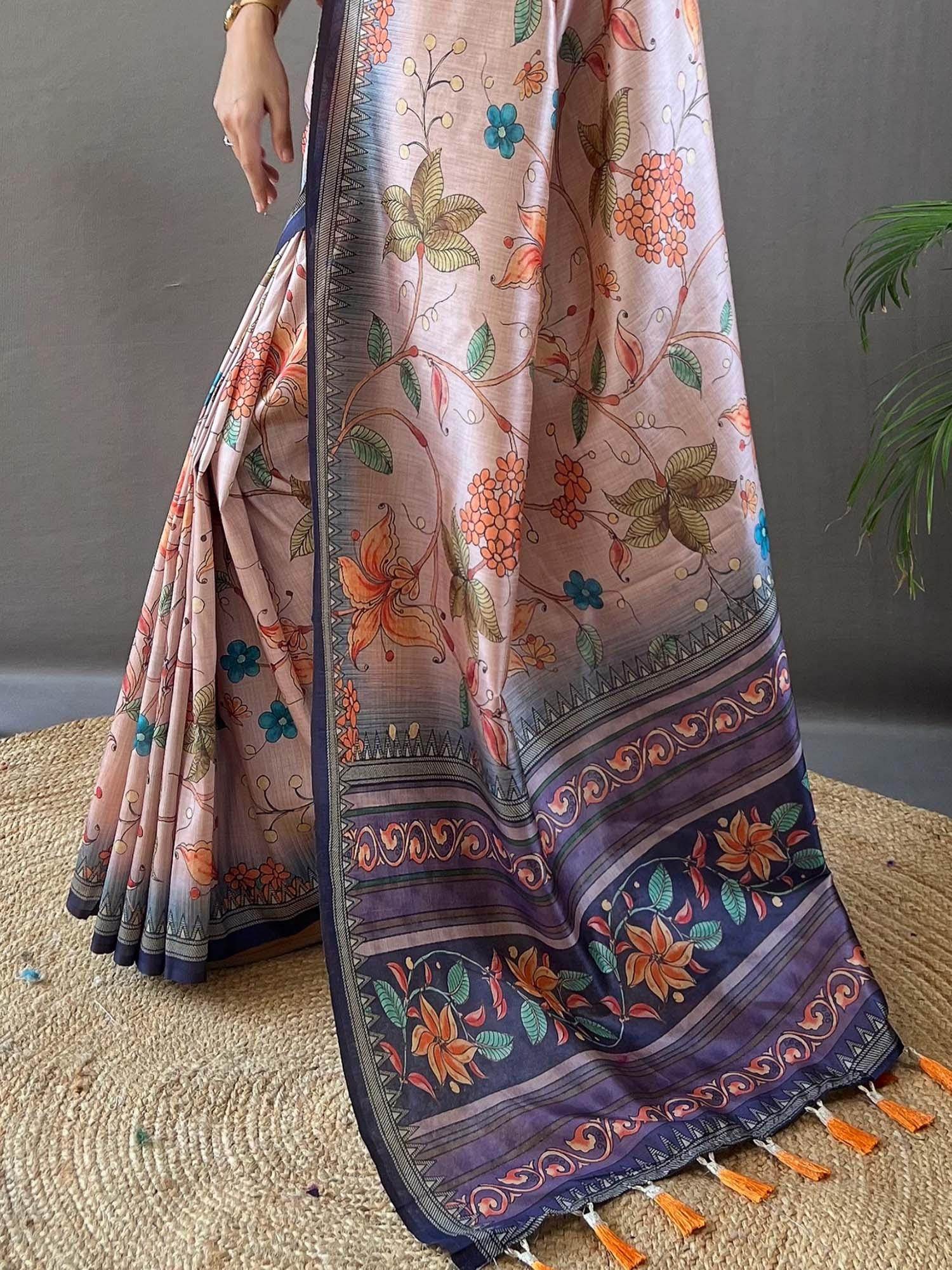 This stunning saree features a beautiful combination of peach and blue colors, adorned with intricate kalamkari print work that adds a traditional touch to the ensemble. The saree also comes with attached tassels on the pallu, adding a playful yet fashionable element to the overall look.