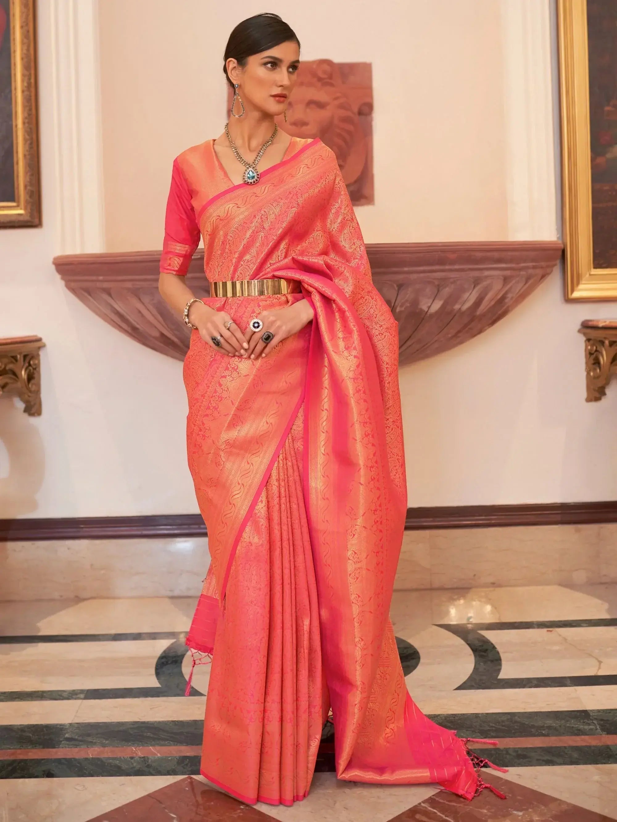 This stunning ensemble is the perfect choice for weddings, festivals, and other special occasions. The vibrant pink color of the silk saree is complemented by intricate zari weaving work, making it a truly standout piece that will turn heads wherever you go.
