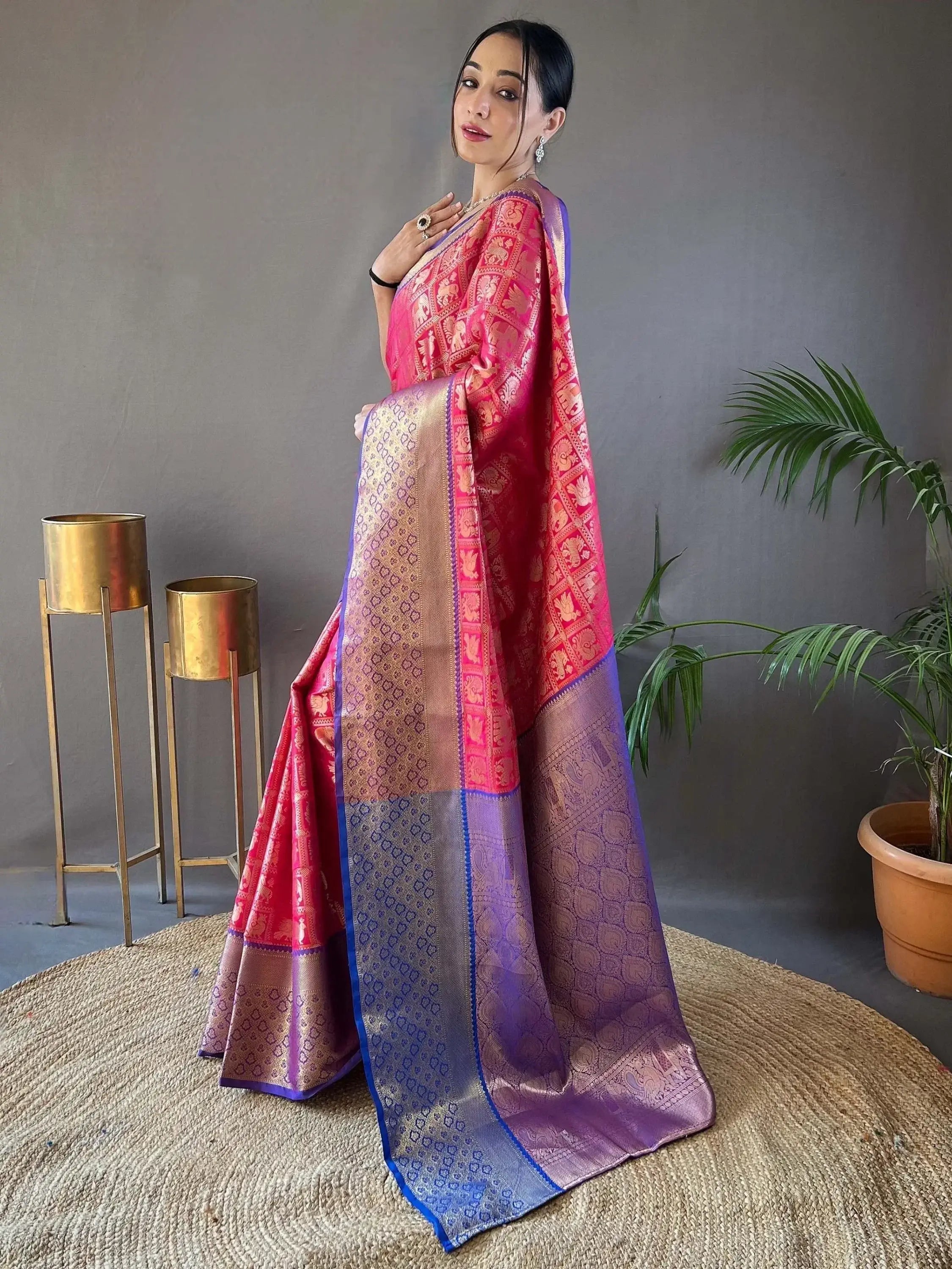 Our enchanting pink zari weaving silk function wear saree with blouse is a timeless and elegant piece that will make you stand out at any event. Add this classic saree to your wardrobe today and elevate your ethnic wear game to the next level.
