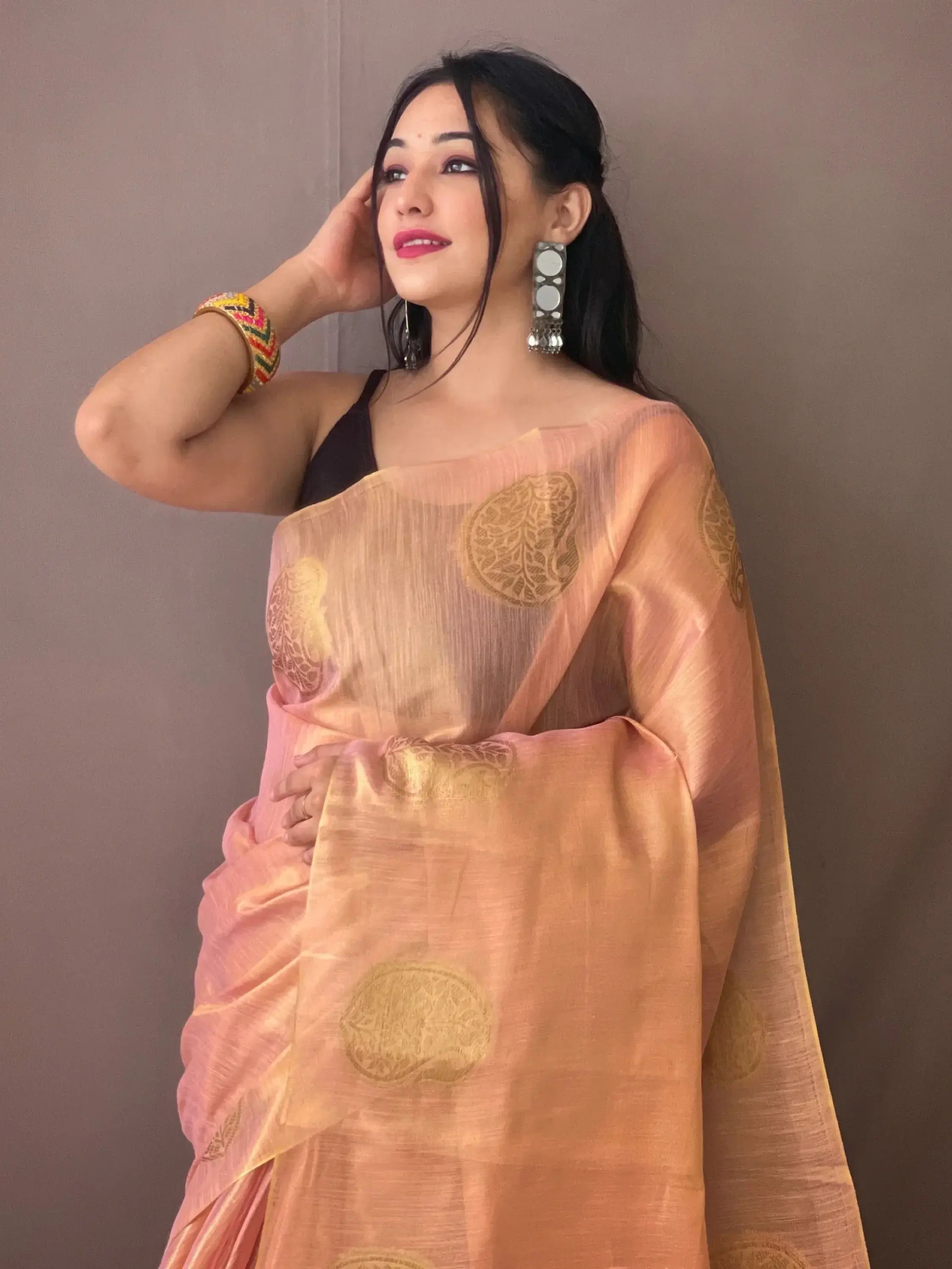 Our enchanting pink zari weaving tissue silk function wear saree is the perfect addition to your ethnic wear collection. Whether you are attending a wedding, festival, or any other event, this saree will make you feel like a true fashionista. Get ready to turn heads and receive compliments wherever you go with this exquisite saree.
