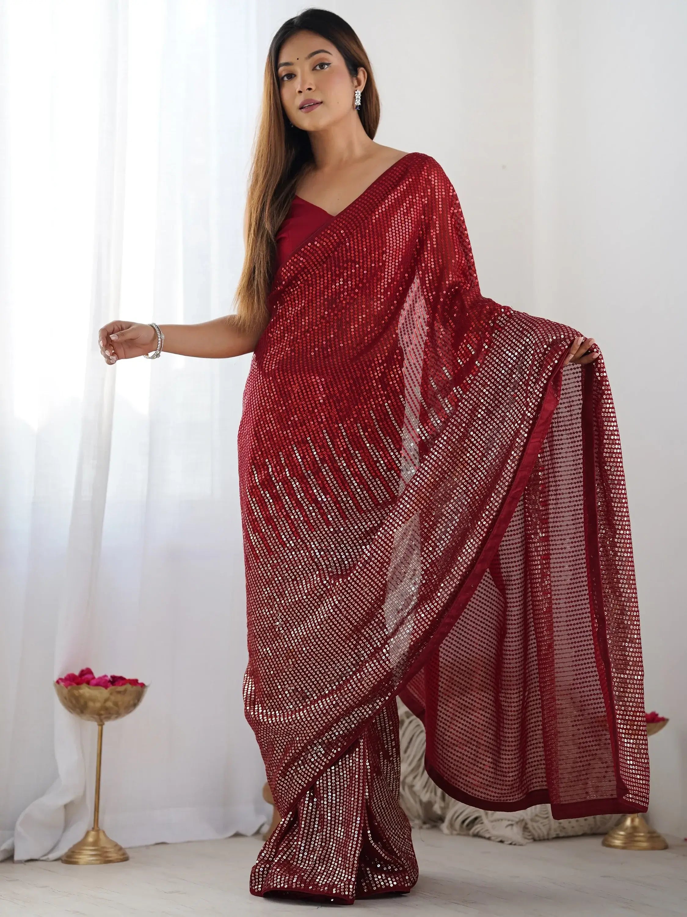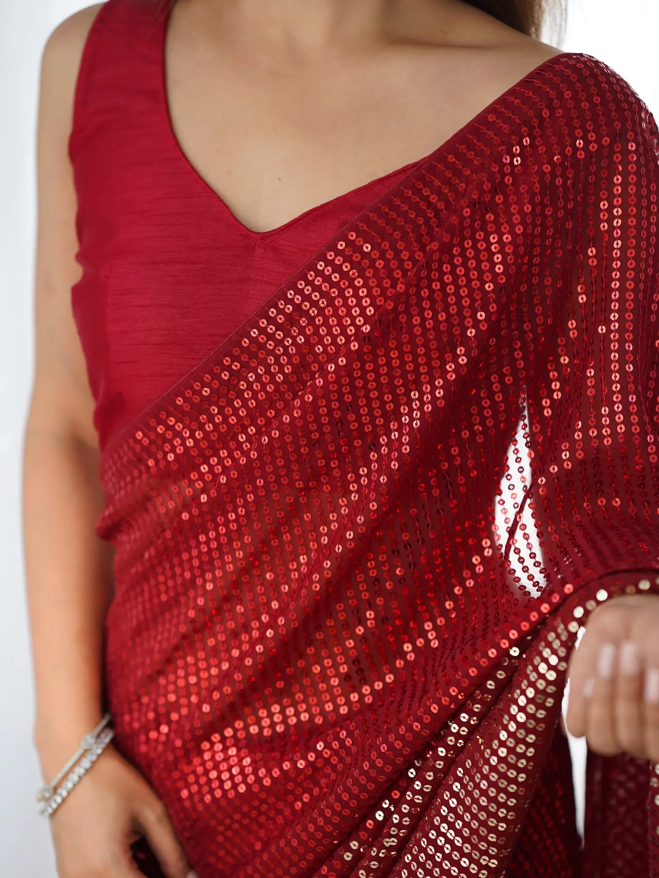 This red saree is designed with intricate sequin and embroidered work, adding a touch of elegance and glamour to your ethnic look. The saree comes with a similar color silk blouse for a complete ensemble.