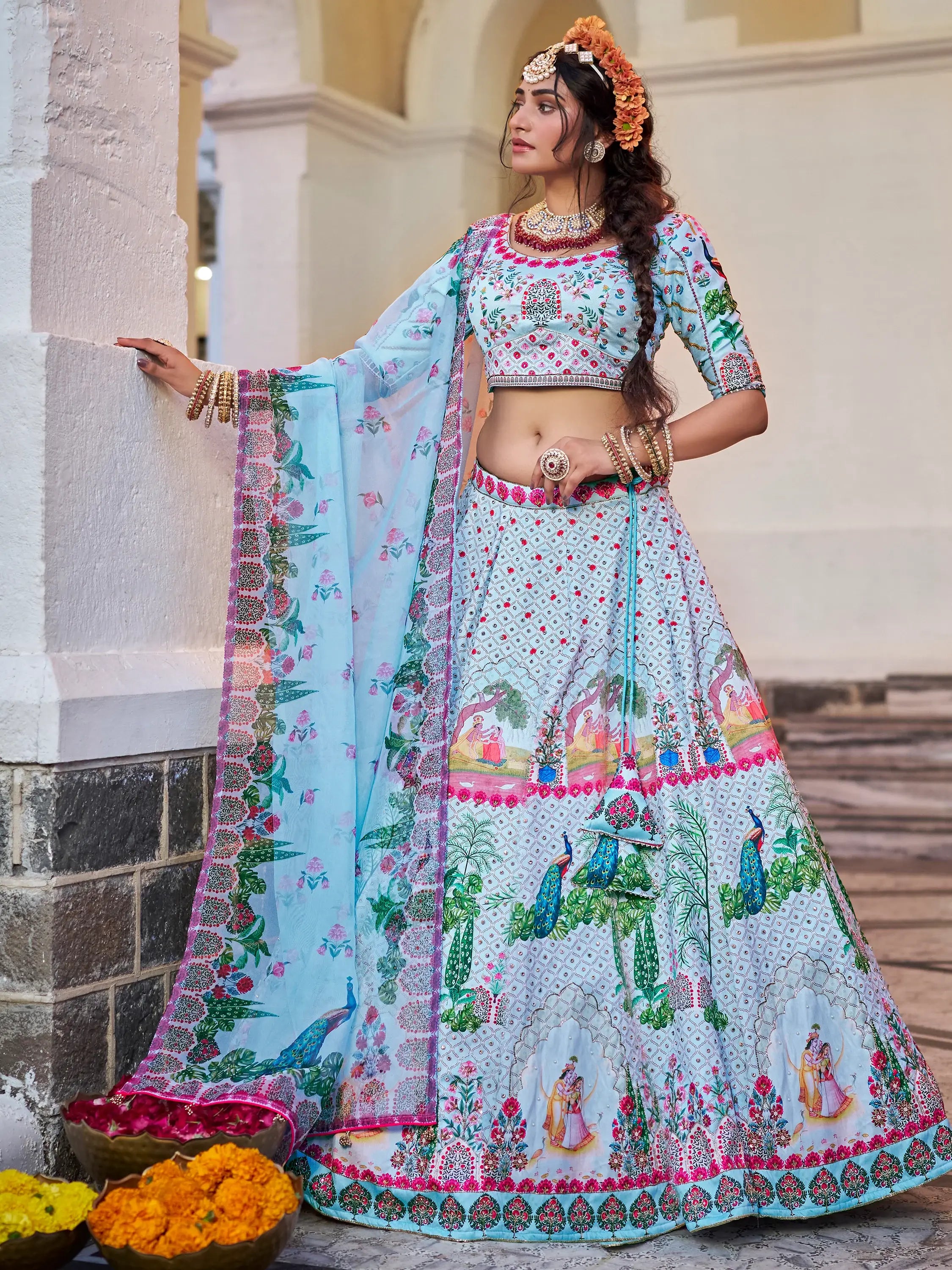 Elevate your ethnic wardrobe with our enchanting sky-blue printed art silk festival wear lehenga choli. This stunning ensemble includes a sky-blue color art silk lehenga with handwork and digital traditional print, a matching art silk choli with intricate handwork and digital printwork, and a similar color organza dupatta with printwork and handwork.